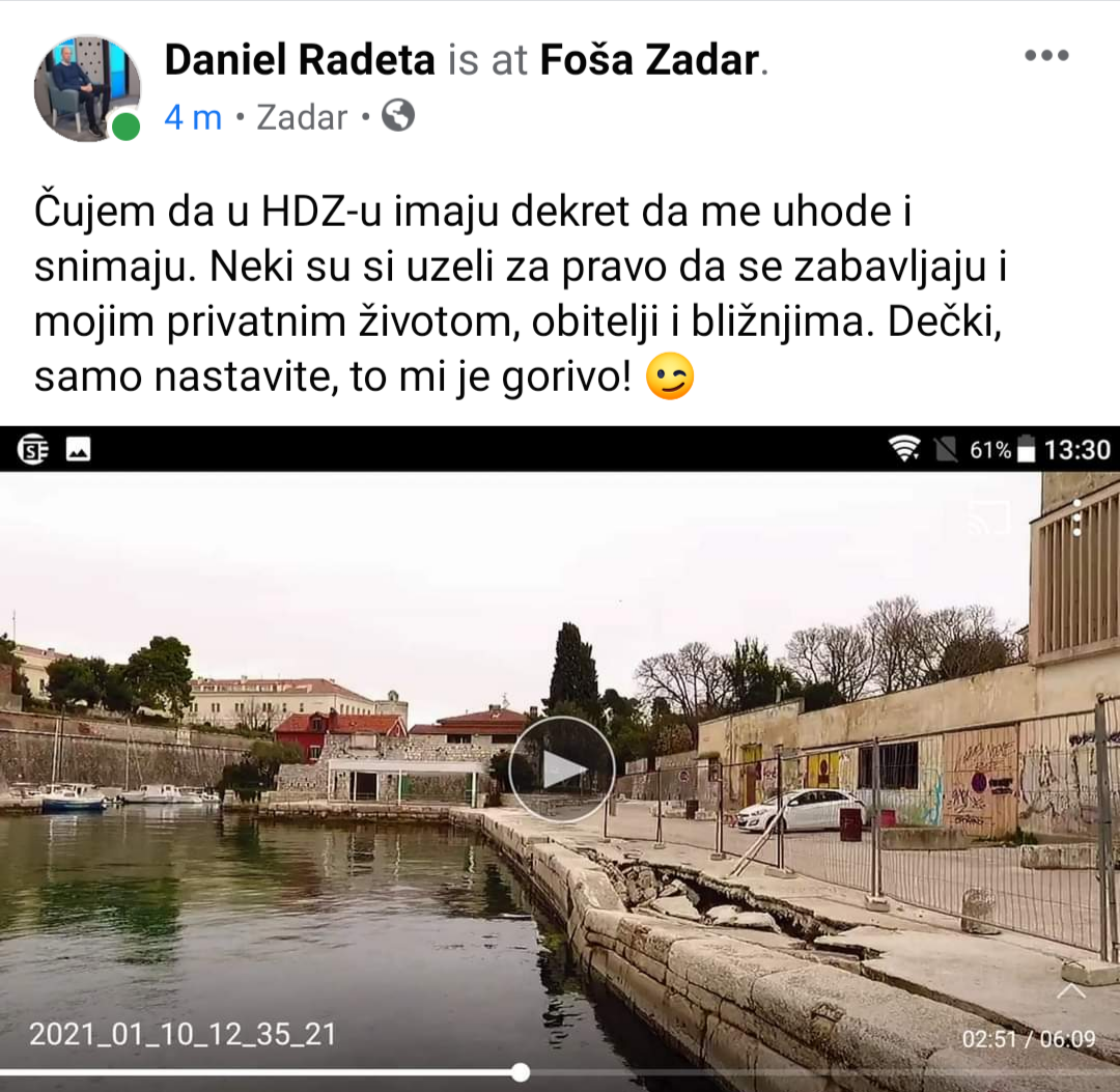 Predsjednik gradske organizacije zadarskog SDP-a Daniel Radeta optužio je na svom Facebook profilu HDZ-ovce da na uhode i snimaju. Kazao je i kako se pripadnici te stranke zabavljaju njegovim privatnim životom, obitelji i bližnjima.