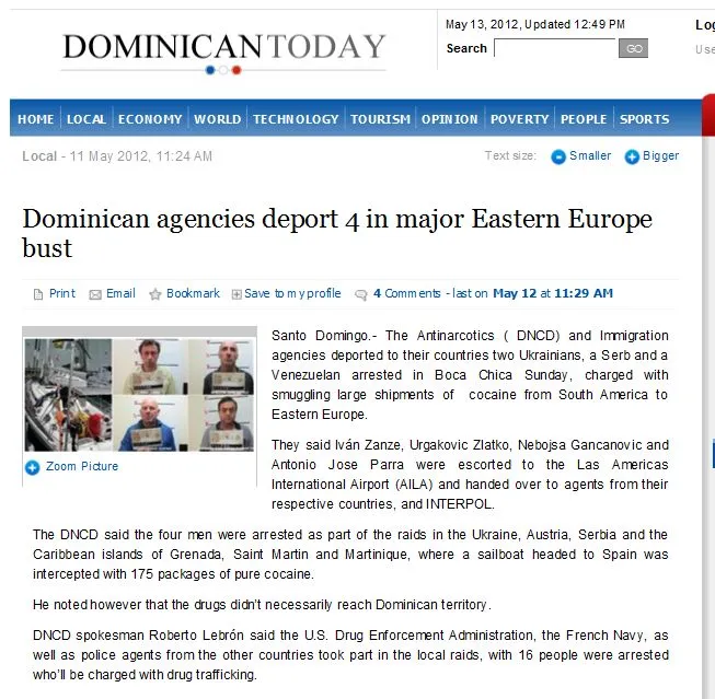Hrvatski krijumčari osam milijuna eura vrijednoga čistog kokaina, koji su prošli tjedan uhićeni u Boca Chica, malom pomorskom mjestu na Karibima, 11. svibnja deportirani su, odnosno prepraćeni na Las Americas međunarodni aerodrom (AILA), gdje su potom izručeni agentima iz njihovih zemalja i Interpolu, piše Dominican Daily portal pozivajući se na Roberta LeBrona, DNCD-ova glasnogovornika. Iako tu informaciju nitko u Hrvatskoj tijekom proteklog vikenda nije službeno potvrdio, dominikanski portal javlja kako je to učinjeno temeljem raspisanih crvenih Interpolovih tjeralica za krijumčarima osumnjičenim za međunarodnu trgovinu kokainom iz Južne Amerike u Europu.