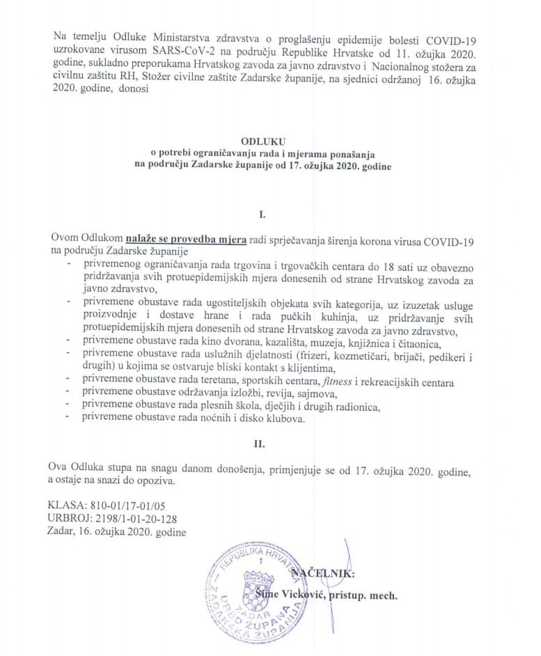 Stožer civilne zaštite Zadarske županije donio je Odluku koju prenosimo u cijelosti: