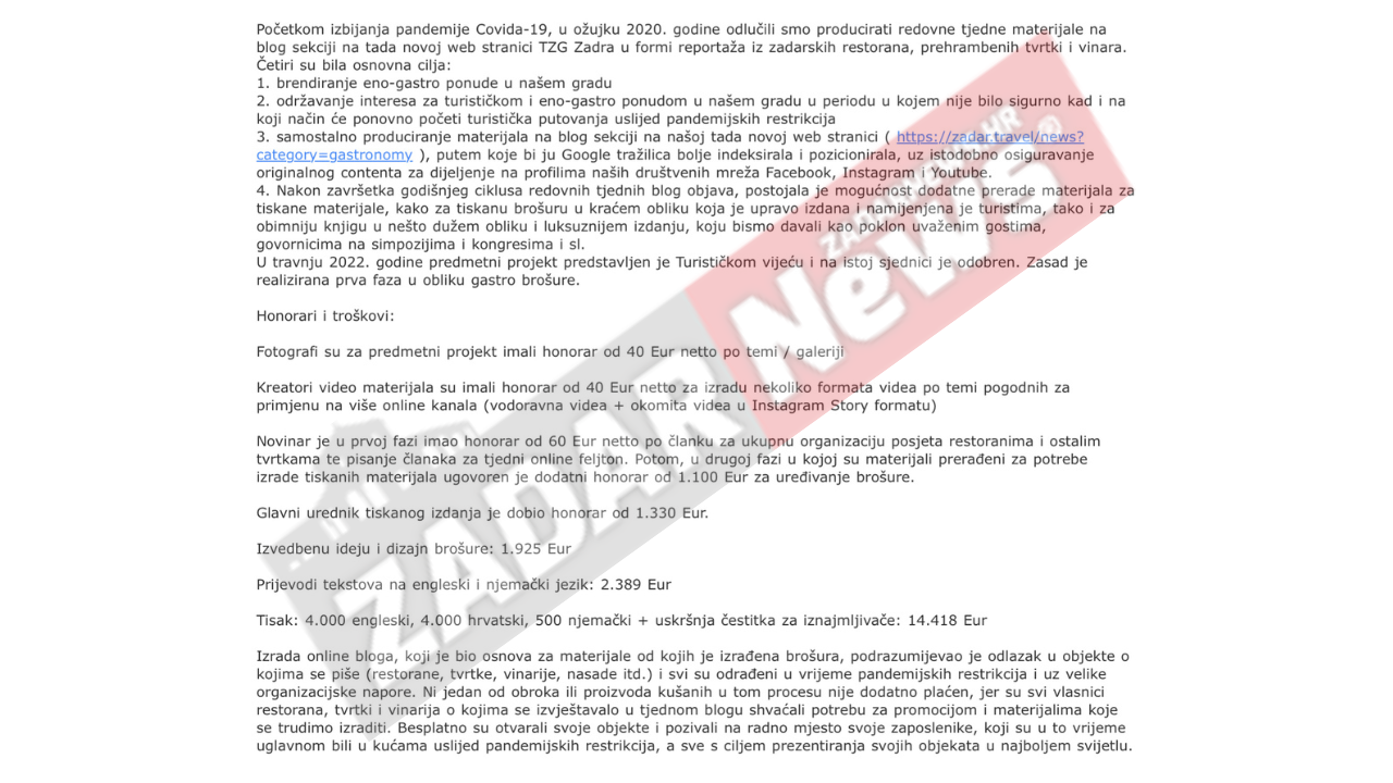 Iz gore navedenog službenog dokumenta Turističke zajednice Grada Zadra jasno je vidljivo kako je na izradu web stranice, brošura, honorare i tekstove “novinara” Marija Vuksana potrošeno više od 100 tisuća kuna. Nije jasno ni tko je radio tisak 8500 brošura kao ni uskršnju čestitku za iznajmljivače. Samo taj projekt za koji postoji sumnja da je bio fiktivan i da brošure u tom obimu nikad nisu tiskane koštao je proračun TZGZ 14.418 eura, odnosno 108 tisuća kuna.