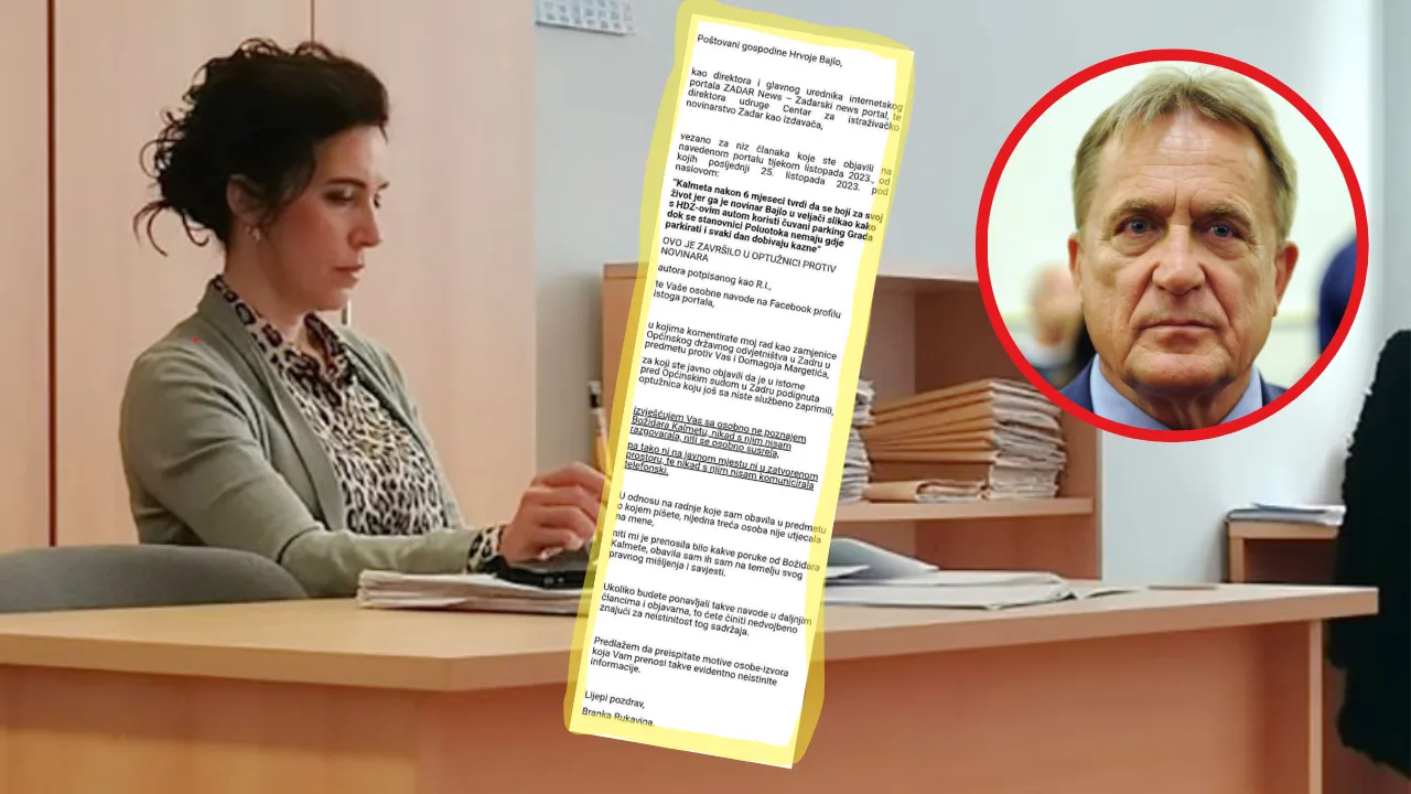 A da je u cijelom predmetu jedini cilj zadarskog Općinskog državnog odvjetništva bio maltretirati novinare i zaustaviti ih kako ne bi nastavili s raskrinkavanjem Kalmetinog mafijaškog klana dokazuje i činjenica da se novinaru Hrvoju Bajlu, o čemu je on više puta izvještavao javnost, sama i iz vedra neba u 7 sati ujutro privatnim e-mailom obratila zamjenica Općinske državne odvjetnice Branka Rukavina koja na taj način pokušava utjecati na novinare protiv kojih je i sama postupala u spornom predmetu, a sve kako i dalje ne bi radili svoj posao.