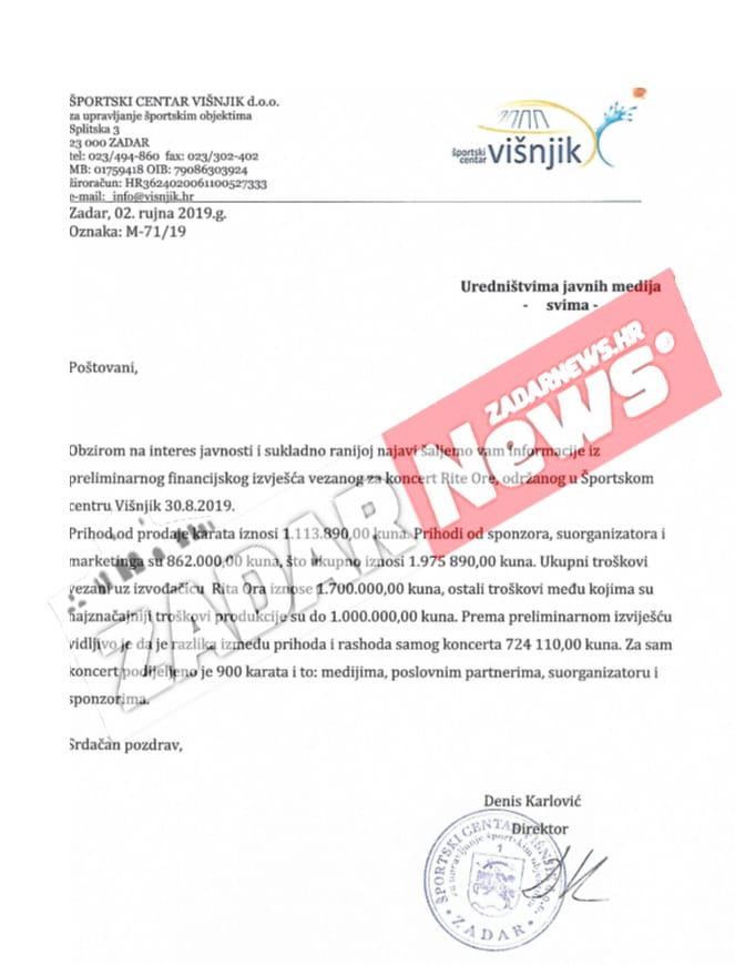 “Obzirom na interes javnosti i sukladno ranijoj najavi šaljemo vam informacije iz preliminarnog financijskog izvješća vezanog za koncert Rite Ore, održanog u ŠC Višnjik.