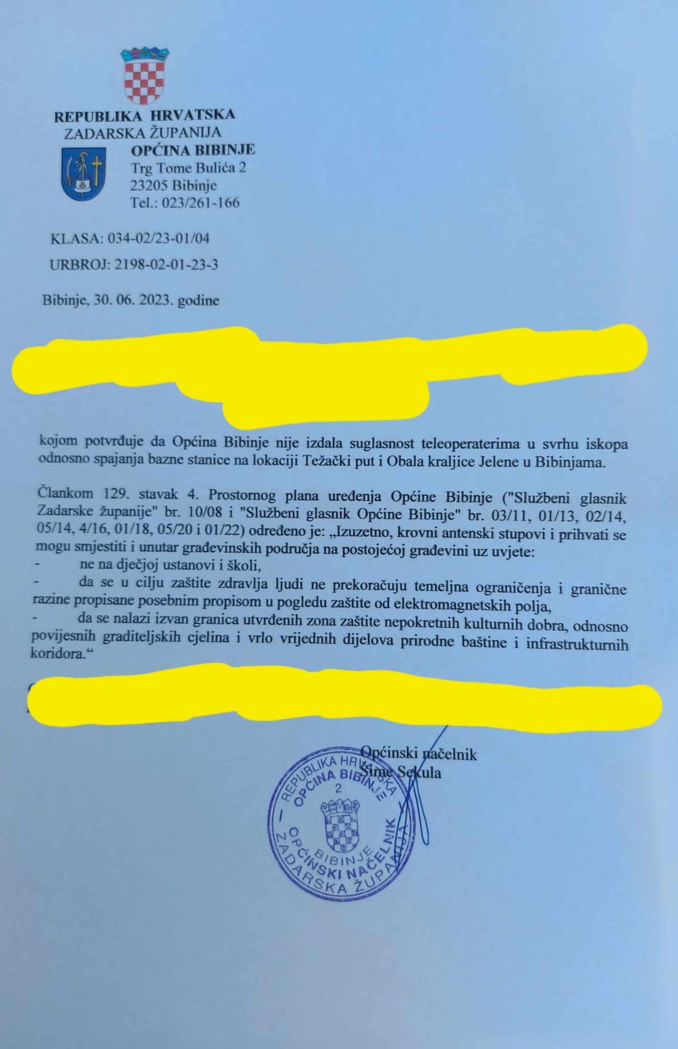 U samom dokumentu jasno stoji kako Općina Bibinje nije izdala suglasnost teleoperaterima u svrhu iskopa odnosno spajanja bazne stanice na lokaciji Težački put i Obala kraljice Jelene u Bibinjama.