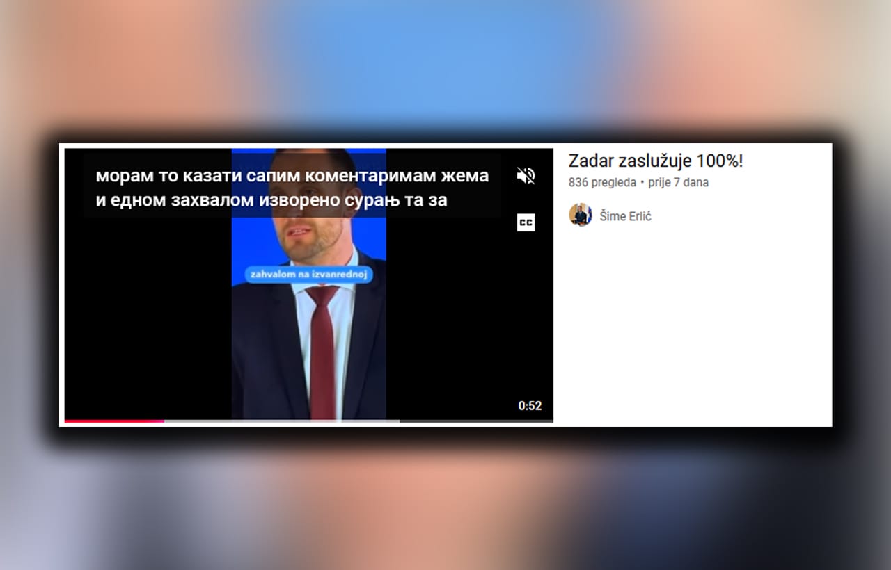 HDZ-ov kandidat za gradonačelnika Zadra Šime Erlić objavio je na svom službenom YouTube kanalu video koji, uz hrvatski prijevod prati i prijevod na ćirilici.