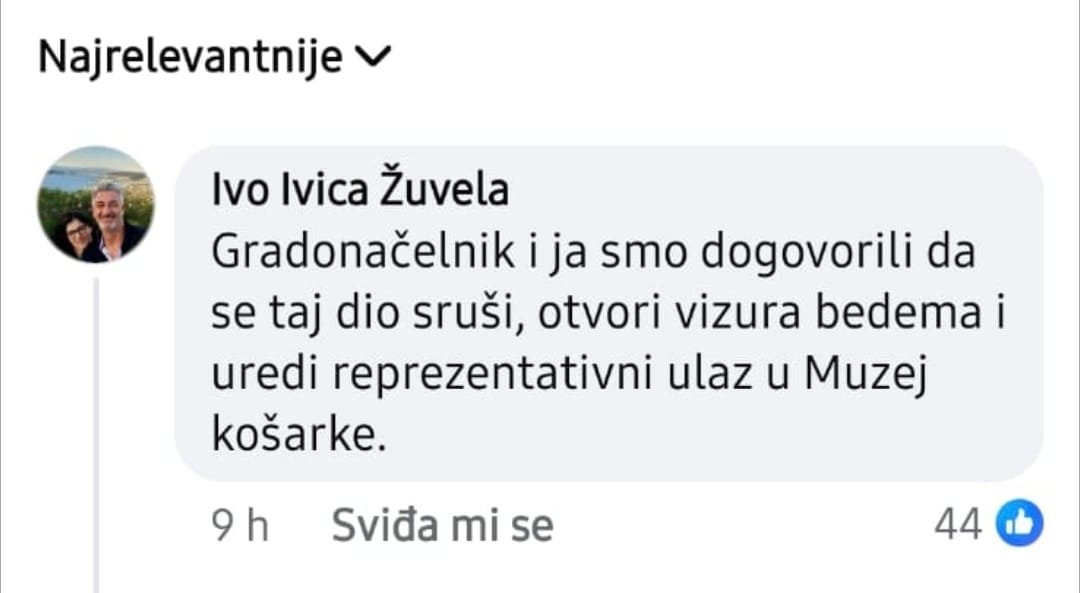 Dok Erlić glumi neodlučnost između rušenja i sanacije, kontrola mu je pobjegla i njegov predsjednik Gradskog vijeća, Ivica Žuvela, pohvalio se u komentarima na društvenim mrežama kako je "osobno dogovorio s gradonačelnikom Erlićem rušenje zgrade". Na upozorenje komentatora da to ne mogu odlučiti njih dvojica već Gradsko vijeće, Žuvela je bahato odbrusio: "A kako vama još nije jasno tko ima većinu u GV?"