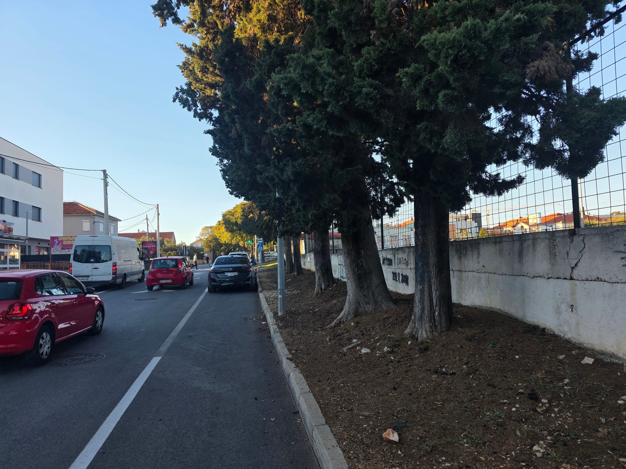 Radi se o nekoliko desetina stabala – čempresa, fafarikula i borova – koja stvaraju dugačak zeleni koridor. Plan predviđa proširenje kolnika na 6,5 metara za dvosmjerni promet, nogostupe širine 3 do 4,5 metara, biciklističke staze od 2,5 metara, kružna raskrižja, potporni zid i parkirna mjesta.