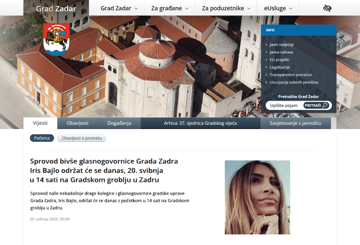 Naime, na službenim web stranicama Grada Zadra osvanula je u noćas u ponoć i šest minuta vijest o tome kako će se danas, 20. svibnja 2025. s početkom u 14 sati na Gradskom groblju u Zadar održati sprovod bivše glasnogovornice Grada Zadra Iris Bajlo.