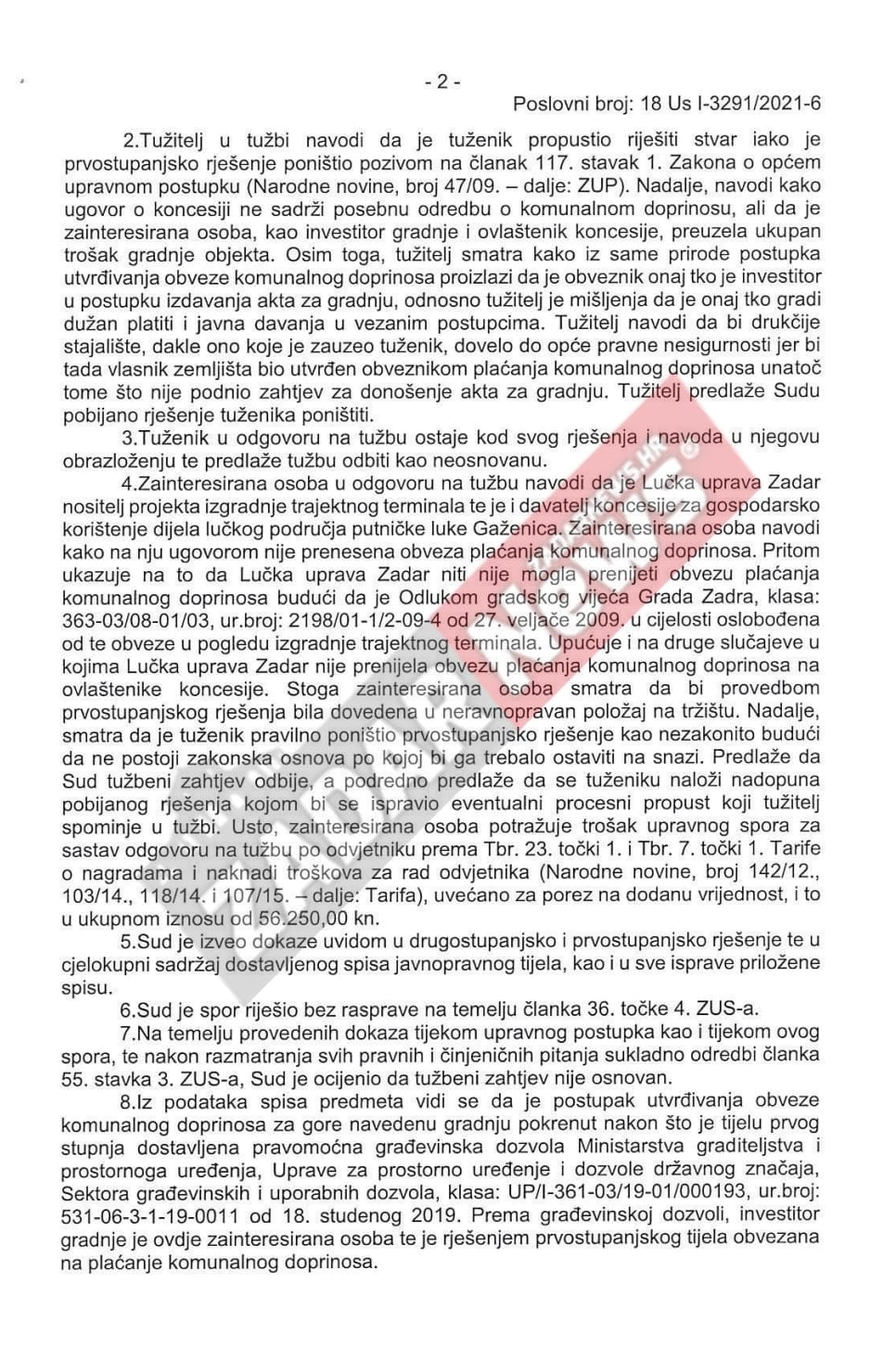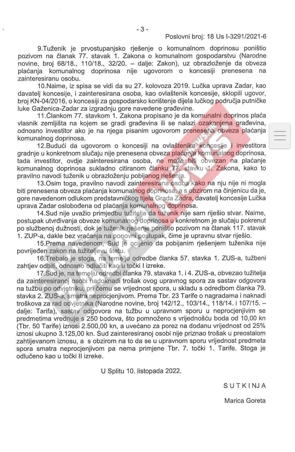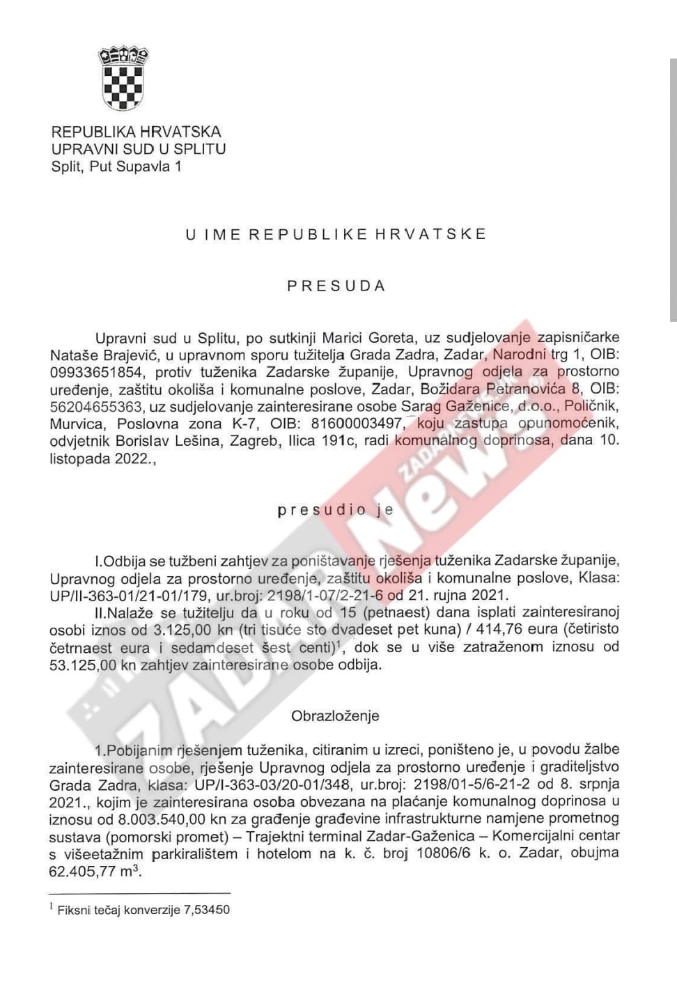Upravni sud u Splitu, po sutkinji Marici Goreta u upravnom sporu tužitelja Grada Zadra, protiv tuženika Zadarske županije, Upravnog odjela za prostorno uredenje, zaštitu okoliša i komunalne poslove, uz sudjelovanje zainteresirane osobe Sarag Gaženica d.o.o., koju zastupa opunomoćenik, odvjetnik Borislav Lešina radi komunalnog doprinosa, dana 10. listopada 2022., presudio je kako se odbija tužbeni zahtjev za poništavanje rješenja tuženika Zadarske županije, Upravnog odjela zaprostorno uređenje, zaštitu okoliša i komunalne poslove.