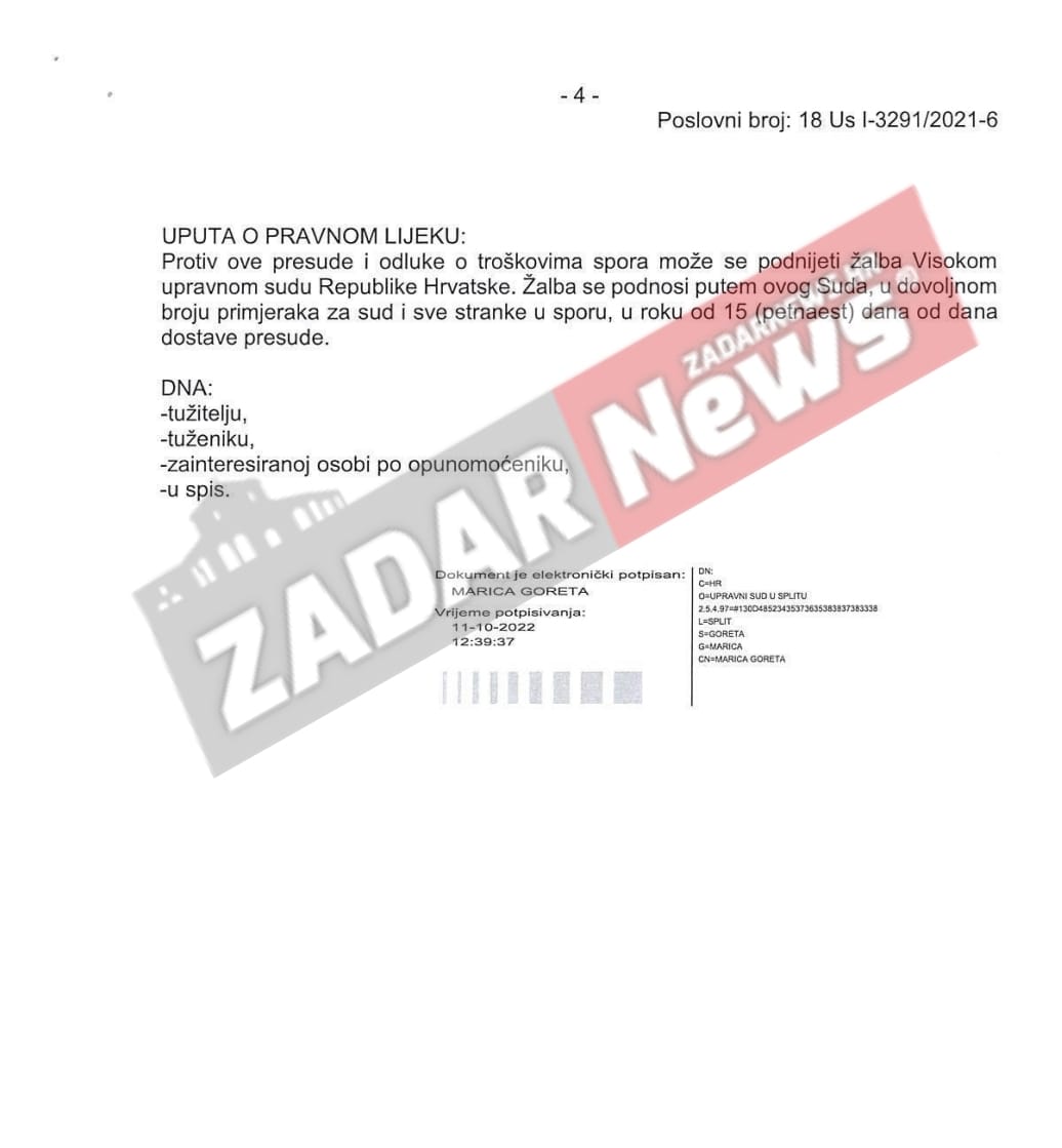 U nastavku objavljujemo presudu na koju Grad Zadar nema pravo žalbe.