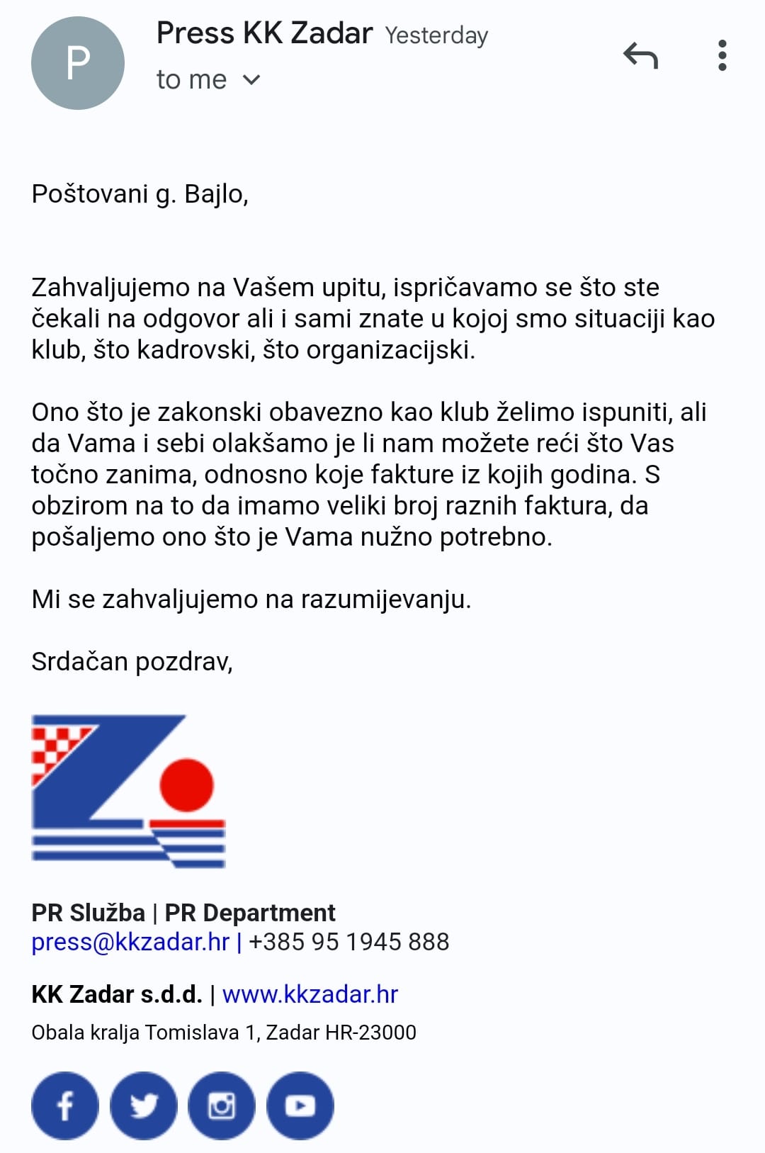Prema Zakonu o pravu na pristupu informacija, s obzirom na upit koji je ZADAR News ponovio prema novoizabranom direktoru KK Zadar, Davidu Gunjeviću, ZADAR Newsu jučer je trebao opet dobiti uvid u fakture iz mandata Borisa Skroće, ali po novome i Željka Žilavca.