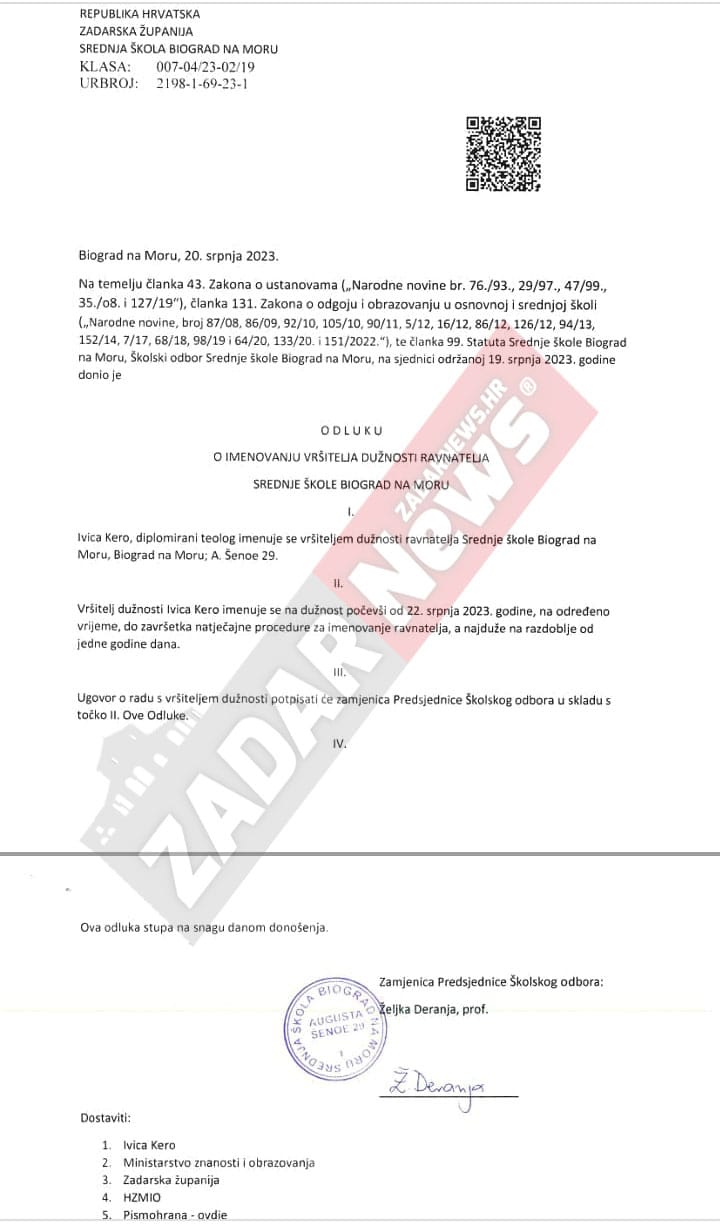 Nakon što je ZADAR News objavio posljednji članak u nizu o notornom Ivici Keru, sada već bivšem ravnatelju Srednje škole Biograd na Moru i vjerojatno najpoznatijoj osobi sa šireg zadarskog područja koja je svojim nehumanim djelovanjem završila na Zavodu za zapošljavanje, na web stranicama škole osvanule su odluke i zapisnici Školskog odbora u kojima unatoč preciznim odredbama zakona da Ivica Kero ne može biti imenovan za v.d.-a ravnatelja nakon što mu je ministar Radovan Fuchs uskratio suglasnost, sada već smijenjeni Školski odbor (članovi iz reda nastavnika i član iz reda roditelja) ponovno su protuzakonito imenovali Kera vršiteljem dužnosti ravnatelja.