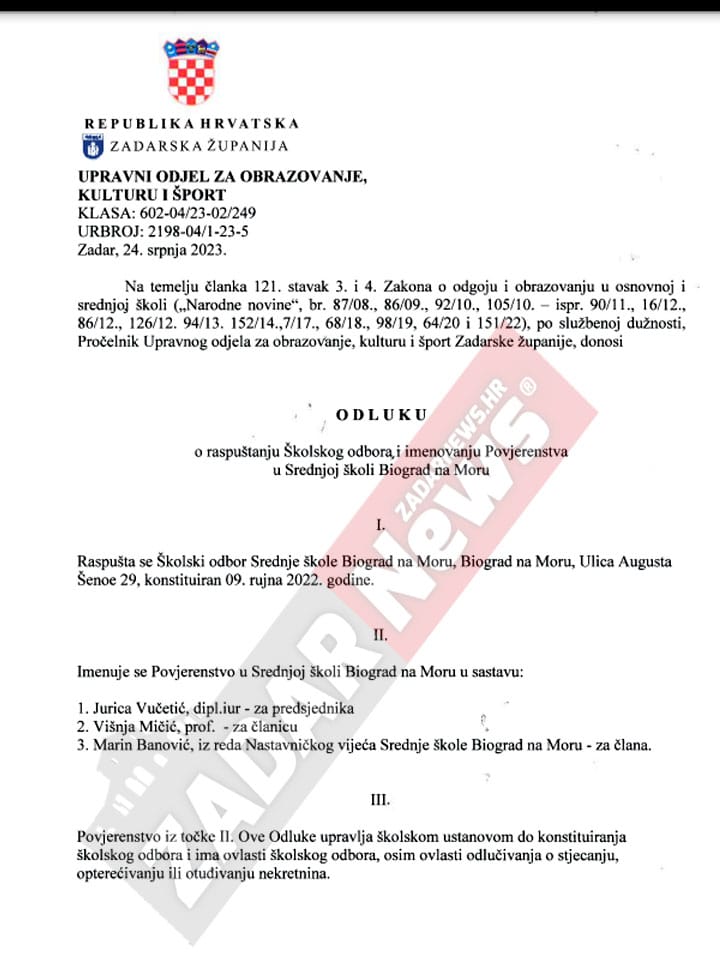 Zadarska županija kao osnivač škole razriješila je Školski odbor