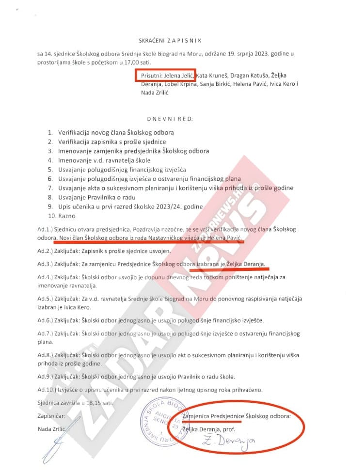 Zanimljiva je i činjenica da je sve te odluke i zapisnik potpisala zamjenica predsjednice Školskog odbora Željka Deranja iako je u zapisniku navedeno da je predsjednica Školskog odbora Jelić prisutna na sjednici. Iz toga se vrlo jasno da iščitati kako Kero manipulira i upravlja sebi podređenim djelatnicima škole.