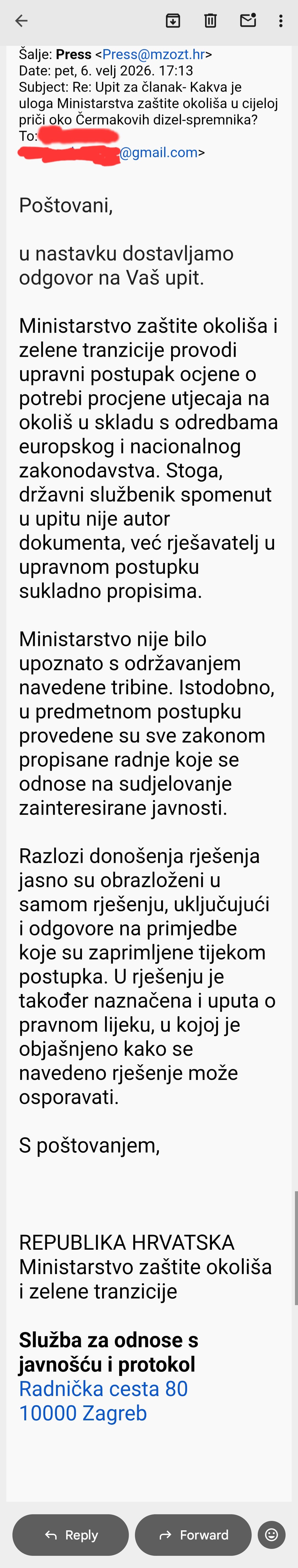 Ministricu Vučković izravno smo kontaktirali da nam da svoj komentar na izostanak predstavnika njenog resora na javnoj tribini u Bibinjama i na cjelokupnu situaciju oko Čermakovih dizel-spremnika u Gaženici. No, ona nas je brže bolje uputila na njenu službu za odnose s javnosti samo kako ne bi izravno odgovarala na novinarska pitanja.