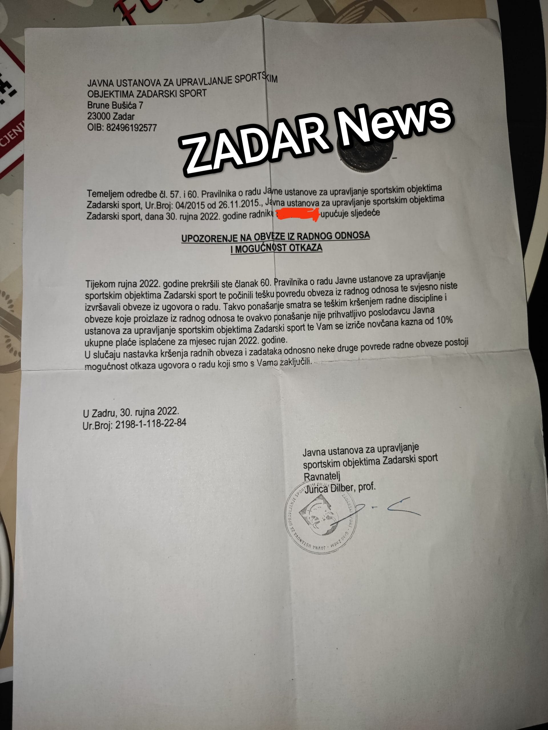 Redakcija portala ZADAR Newsa u posjedu je originalnog dokumenta koji je Dilber preko svog kurira isporučio petorici djelatnika i djelatnica kojima je uručena opomena pred otkaz. Uz to je svima skinuo i 10% od plaće.