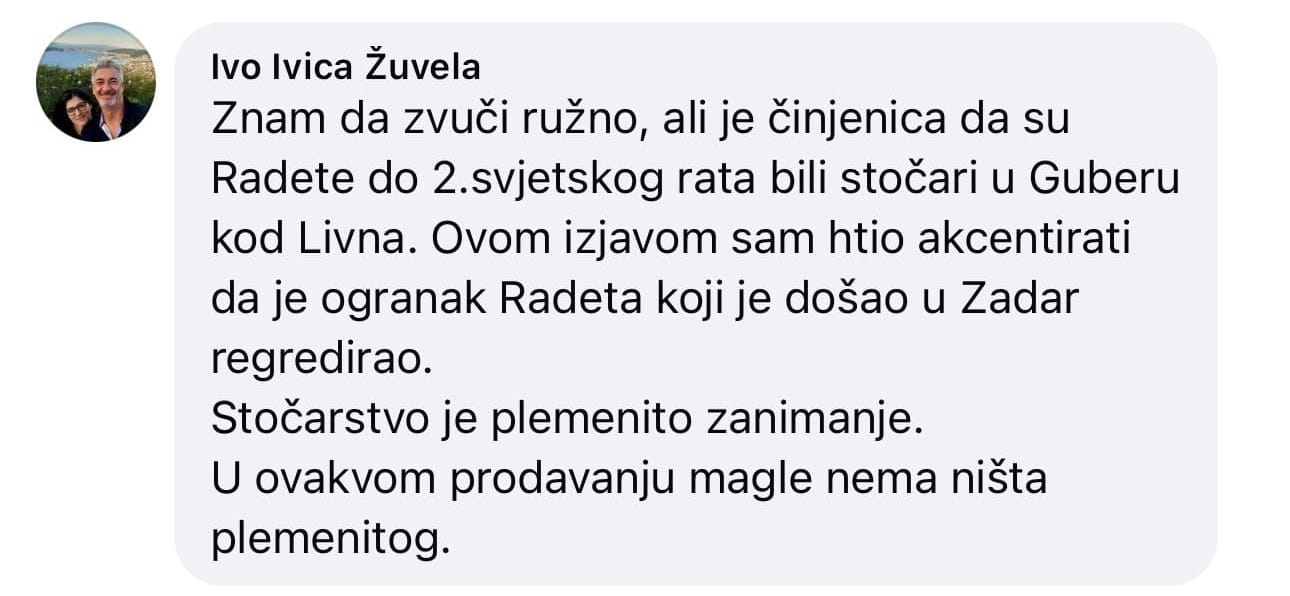 "Znam da zvuči ružno, ali je činjenica da su Radete do 2. svjetskog rata bili stočari u Guberu kod Livna. Ovom izjavom sam htio akcentirati da je ogranak Radeta koji je došao u Zadar regredirao. Stočarstvo je plemenito zanimanje. U ovakvom prodavanju magle nema ništa plemenitog."