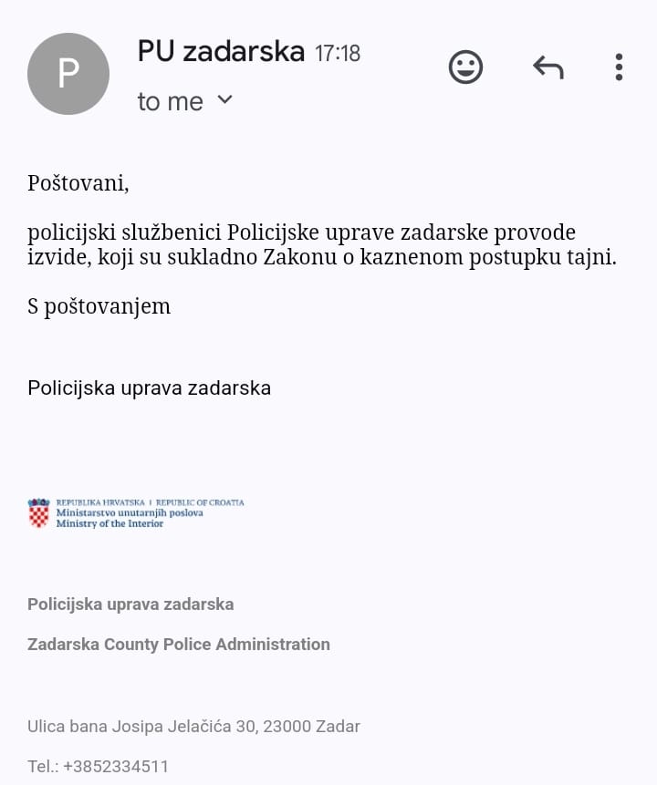 Iz PU zadarske naknadno su izvijestili ZADAR News policijski službenici Policijske uprave zadarske provode izvide, koji su sukladno Zakonu o kaznenom postupku tajni.