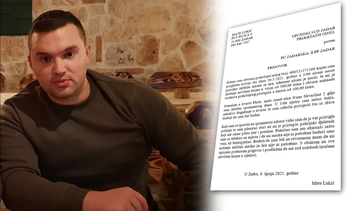 Lukić nam je poslao i prigovor na Obavezni prekršajni nalog koji je poslao Prekršajnom odjelu Općinskog suda u Zadru 8. lipnja, a u kojemu je između ostaloga napisao: