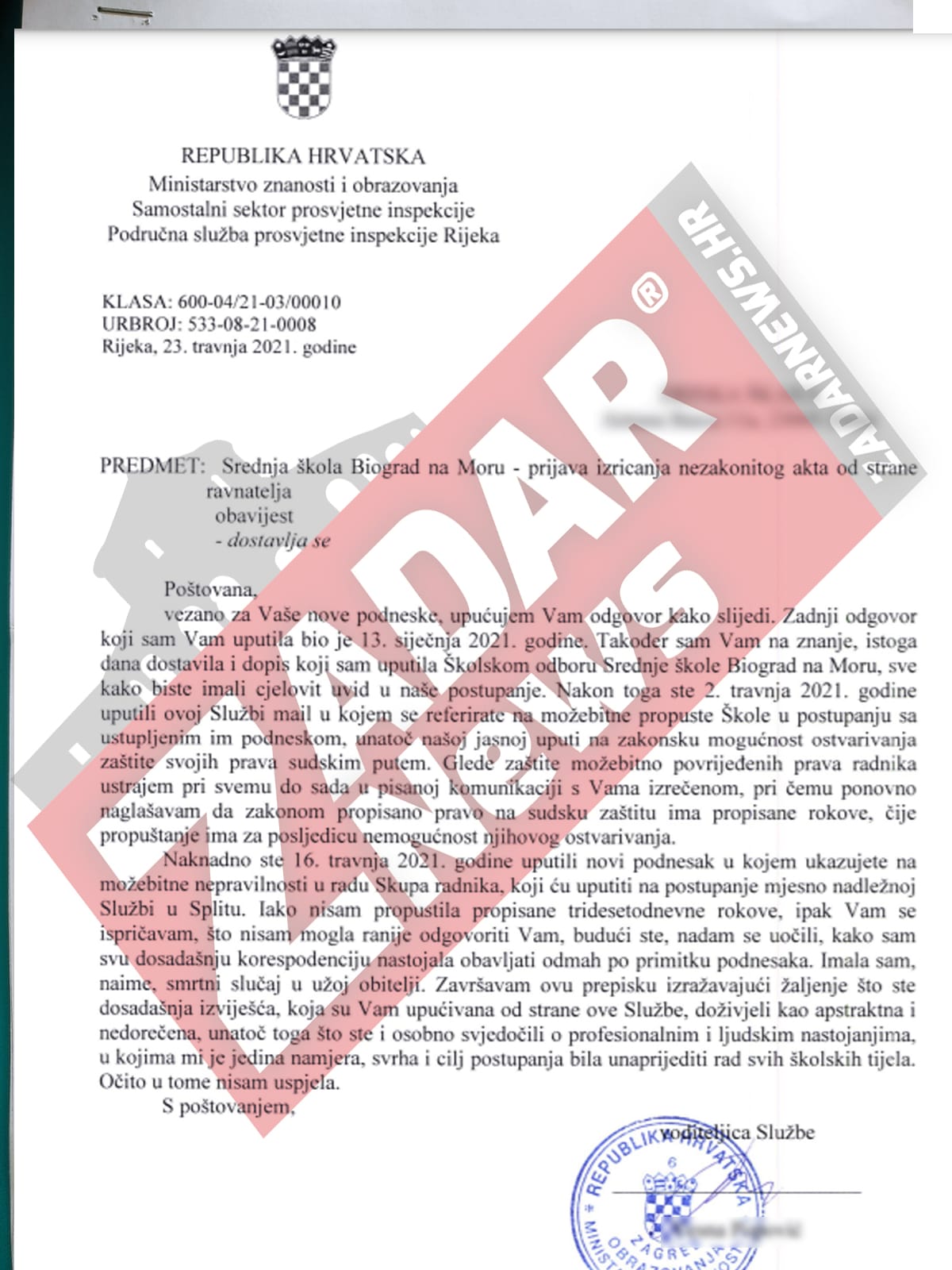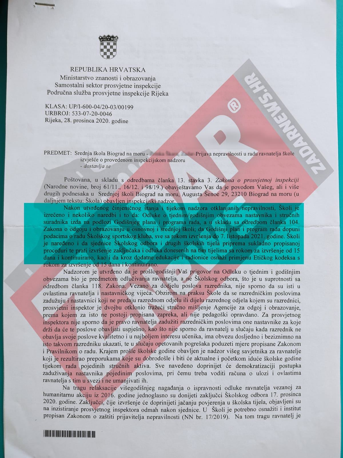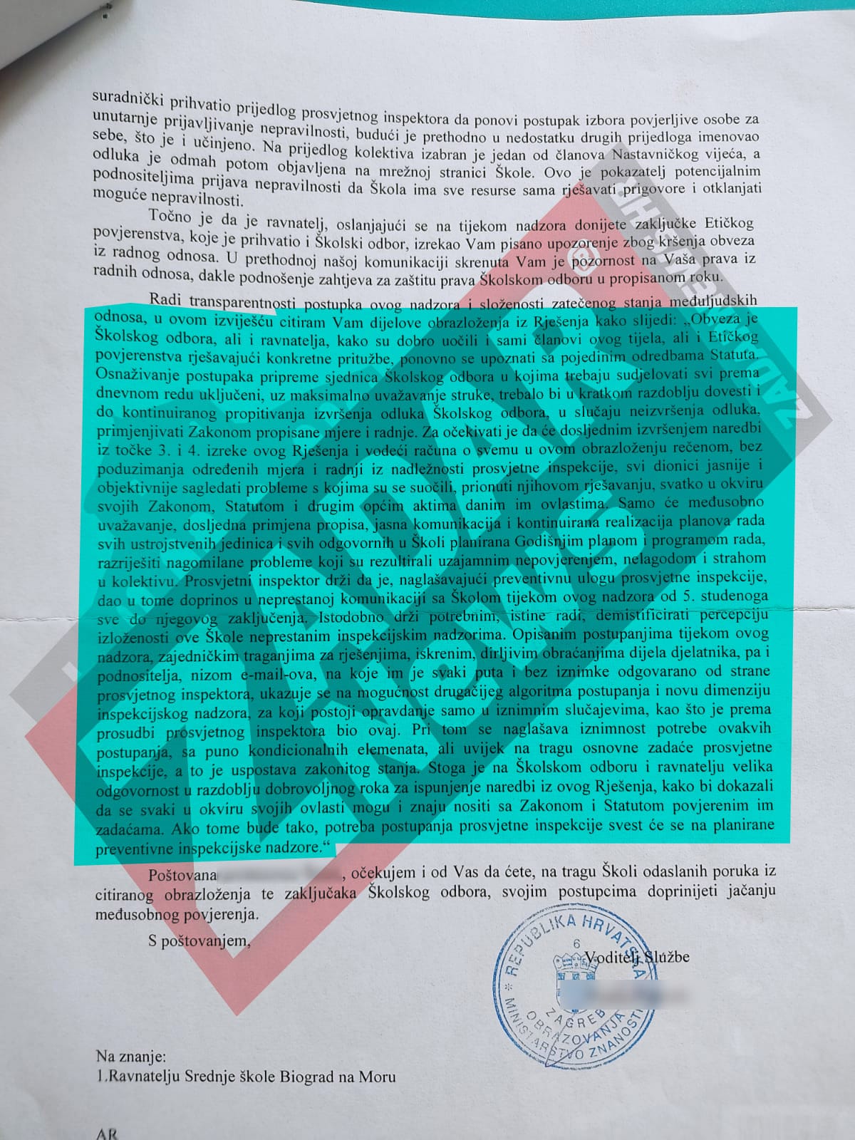 Nakon što smo jučer objavili razgovor s Katarinom Matasić, glasnogovornicom ministra znanosti i obrazovanja Radovana Fucsha, redakcija portala ZADAR News došla je danas u posjed novih dokumenata koji dokazuju kako ravnatelj Srednje škole Biograd na moru Ivica Kero ne poštuje odluke prosvjetne inspekcije Ministarstva znanosti i obrazovanja.