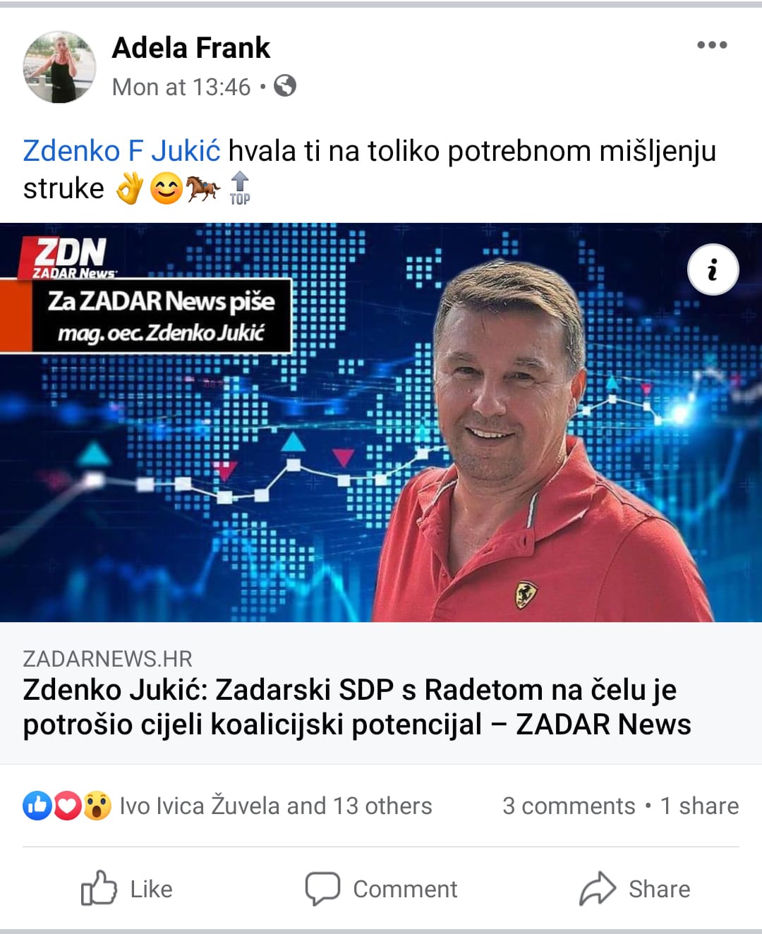 Nakon što je vijećnica u Gradskom vijeću Grada Zadra s Nezavisne liste Enija Meštrovića, Adela Frank na svom Facebooku objavila kolumnu magistra ekonomije, Zdenka Jukića koju je on dan ranije objavio na ZADAR Newsu, u komentare ispod objave javio se notorni vijećnik Akcije mladih, Ante Rubeša.