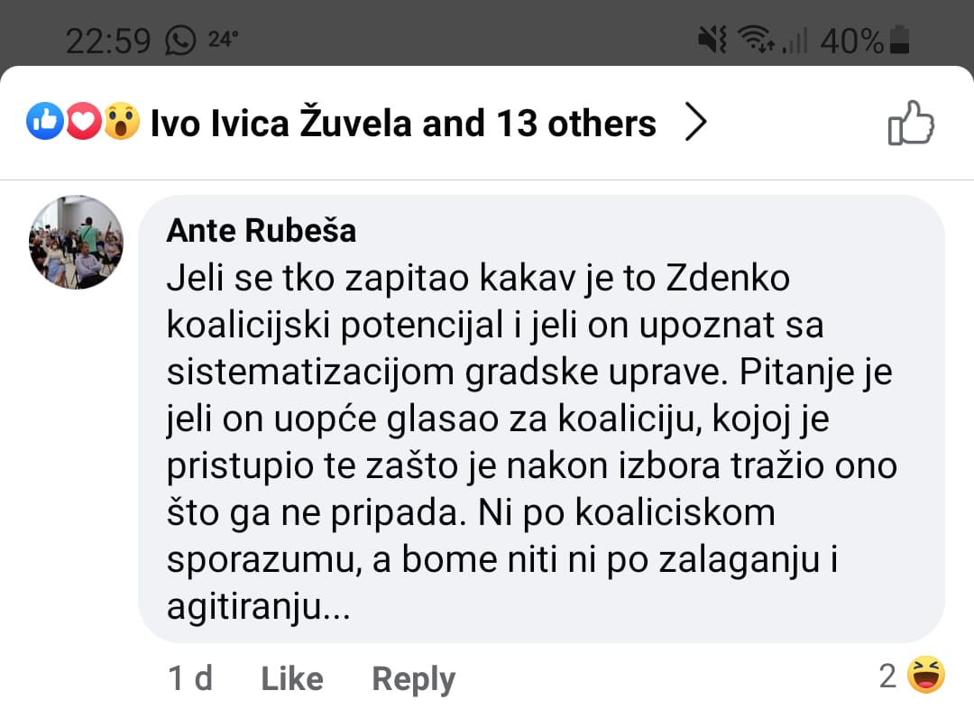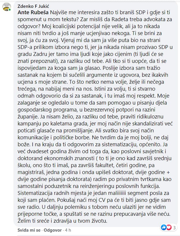 Osim što je napisao gramatički i pravopisno nepismen tekst, Jukića, koji je član koalicije Srcem za Zadar (šef je zadarskog ogranka stranke Centar, op.a.) je javno optužio da je nakon izbora tražio ono što ga ne pripada, što je notorna laž, a o čemu ZADAR News posjeduje obilatu dokumentaciju. Nakon što je vidio komentar, Jukić je reagirao na način da je hladno i brutalno odgovorio Rubeši i tako ga praktički politički ‘resetirao’ objasnivši mu što je u svojoj kolumni napisao.