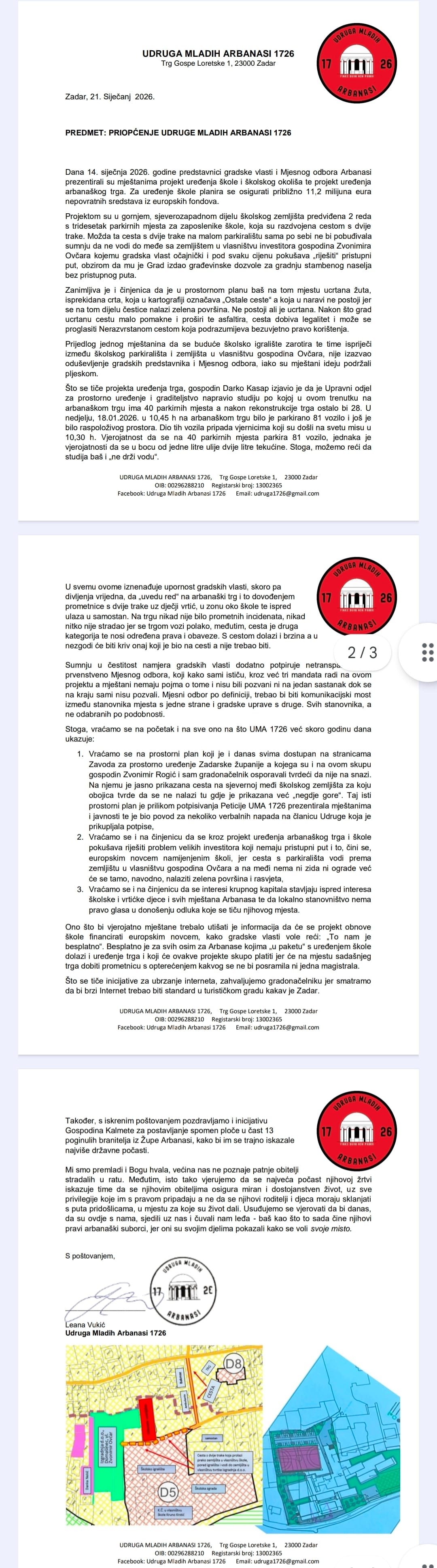 Na njemu je jasno prikazana cesta na sjevernoj međi školskog zemljišta za koju obojica tvrde da se ne nalazi tu gdje je prikazana već „negdje gore“. Taj isti prostorni plan je prilikom potpisivanja Peticije UMA 1726 prezentirala mještanima i javnosti te je bio povod za nekoliko verbalnih napada na članicu Udruge koja je prikupljala potpise
