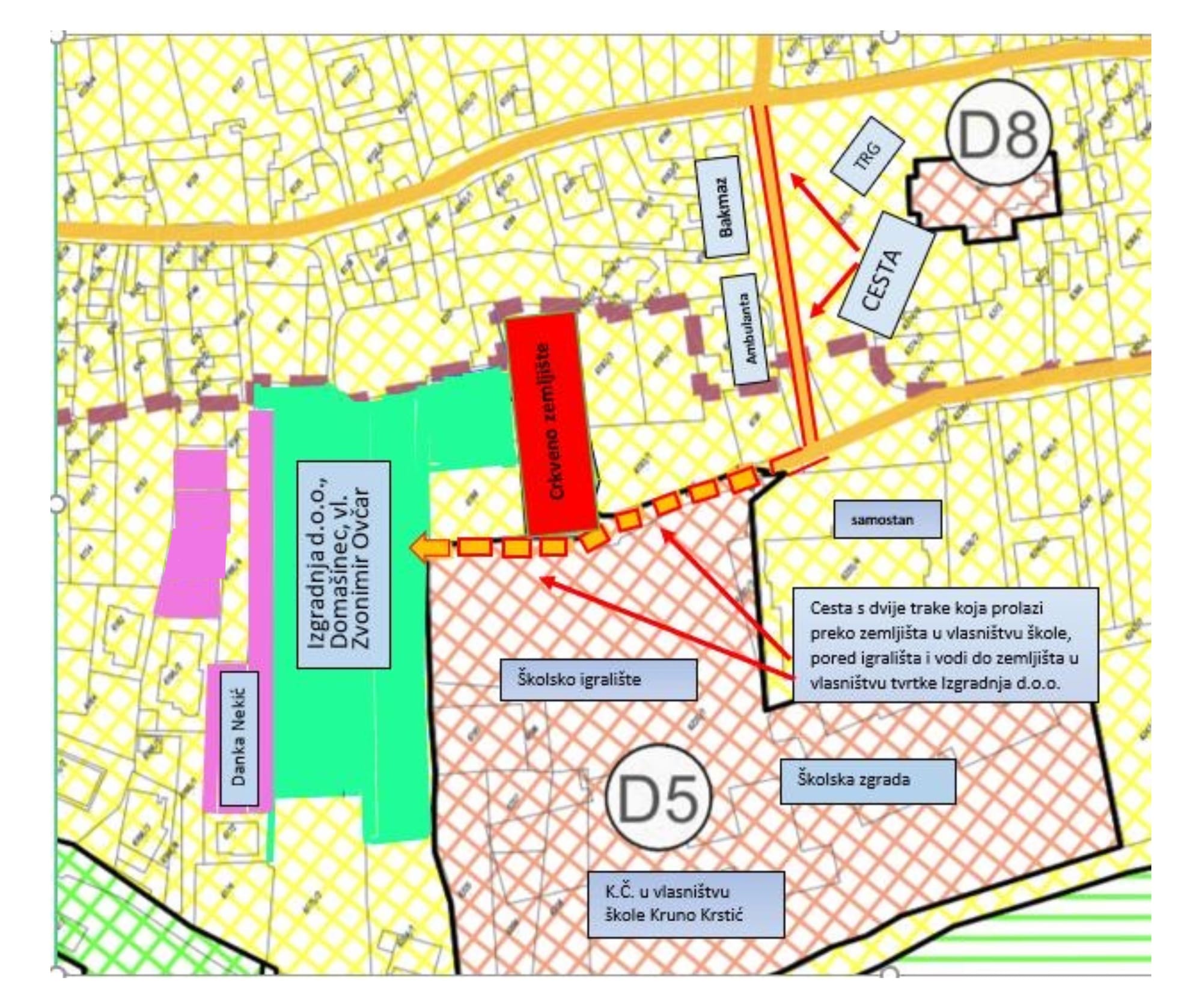 2. Vraćamo se i na činjenicu da se kroz projekt uređenja arbanaškog trga i škole pokušava riješiti problem velikih investitora koji nemaju pristupni put i to, čini se, europskim novcem namijenjenim školi, jer cesta s parkirališta vodi prema zemljištu u vlasništvu gospodina Ovčara a na međi nema ni zida ni ograde već će se tamo, navodno, nalaziti zelena površina i rasvjeta