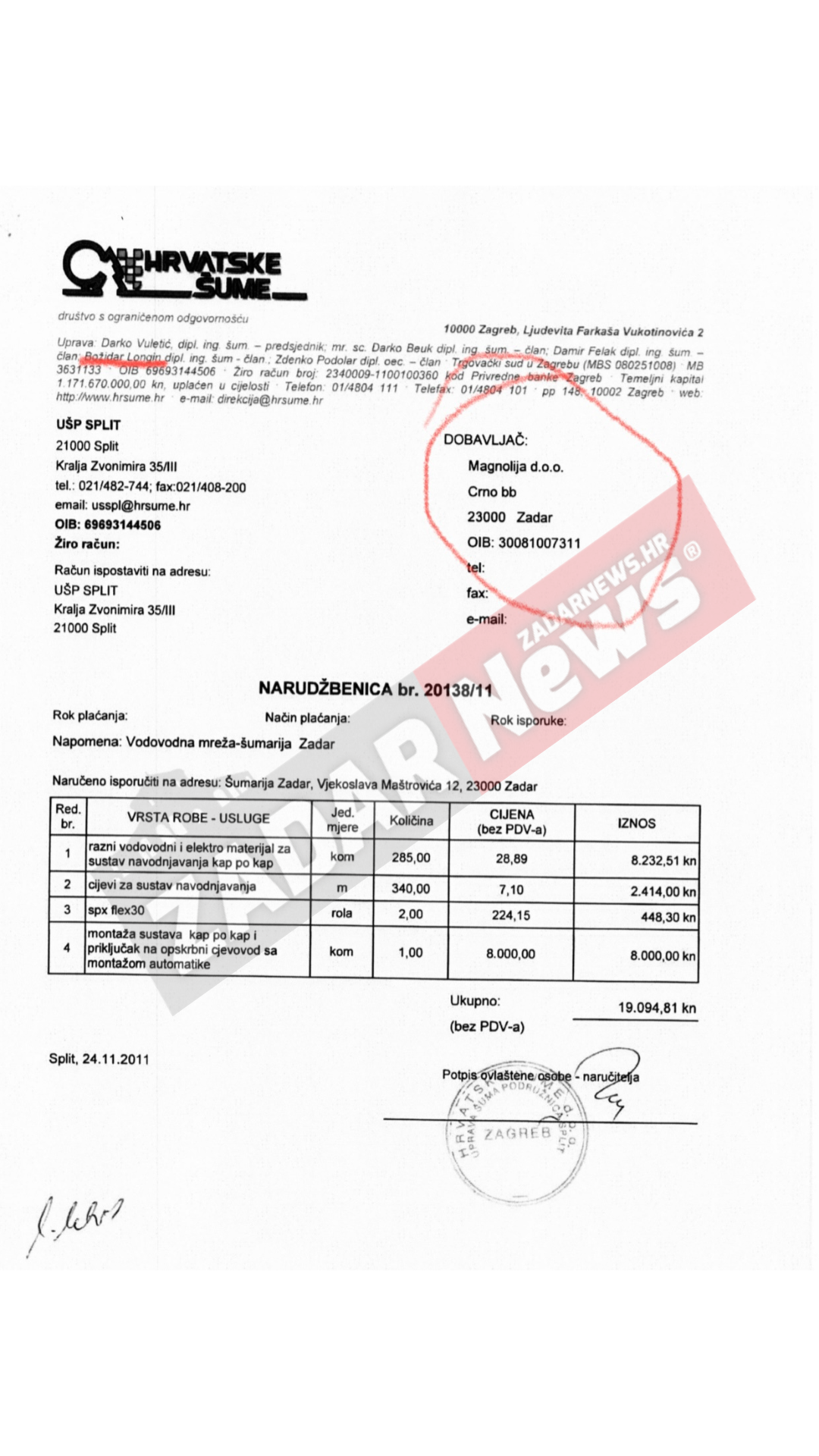 – Radi se o fiktivnoj narudžbenici jer je tvrtki Magnolia d.o.o. hitno trebalo uplatiti oko 20 tisuća kuna na račun kako bi se izbjegla javna nabava, pa i mala nabava. Ništa od navedenoga na fakturi nikad nije isporučeno Hrvatskim šumama i to svi znaju – govori nam izvor iz Hrvatskih šuma koji je želio ostati anoniman.