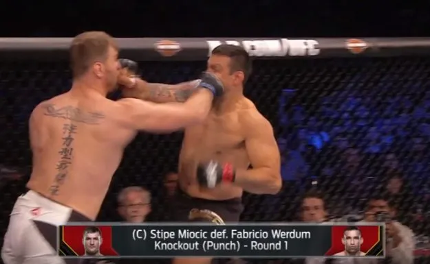 Borba Miočića i Werduma započela je vrlo oprezno, odnosno na distanci, s koje nitko nije bio spreman krenuti u agresivniji napad. Miočić u prvoj minuti brani pomalo stidljiv pokušaj rušenja, nakon čega Werdum ipak unosi malo hrabrosti u borbu. Miočić je ipak jako dobro radio kickovima, čime nije dozvoljavao Werdumu da uhvati tempo.Nakon otprilike dvije i pol minute borbe, Werdum je ipak napao serijom, koja je pogodila Miočića, malo ga uzdrmavši, no i Stipe je uspio završiti sve to s kontrom. Werdumu je to možda dalo pomalo krivi dojam, pa se zaletio u pokušaju da završi borbu, na što je Miočić pametno krenuo unazad, a onda pronašao pravi trenutak za plasirati desni kroše. To je bio udarac koji je Fabricia Werduma poslao u besvjesno stanje, a Stipi Miočiću donio naslov svjetskog prvaka!