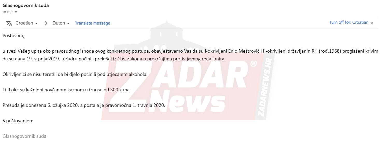 Nakon održanih ročišta, nepravomoćna presuda je donesena 6. ožujka 2020. u kojoj se Enio Meštrović i drugookrivljeni proglašavaju krivima. Konačno, nakon iscrpljenih svih pravnih lijekova, presuda je postala pravomoćna 1. travnja 2020. godine, potvrdio je glasnogovornik Općinskog suda u Zadru Davor Dubravica ZADAR Newsu.