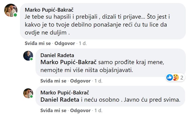 Ispod Facebook objave Daniela Radete na kojoj je prozvao Akciju Mladih i Antu Rubešu za političku korupciju, prodaju za novac i trgovinu utjecajem, uključio se i očito prozvani vijećnik Akcije Mladih Marko Pupić Bakrač koji je napao Radetu napisavši mu kako će mu u lice reći da se debilno ponaša.