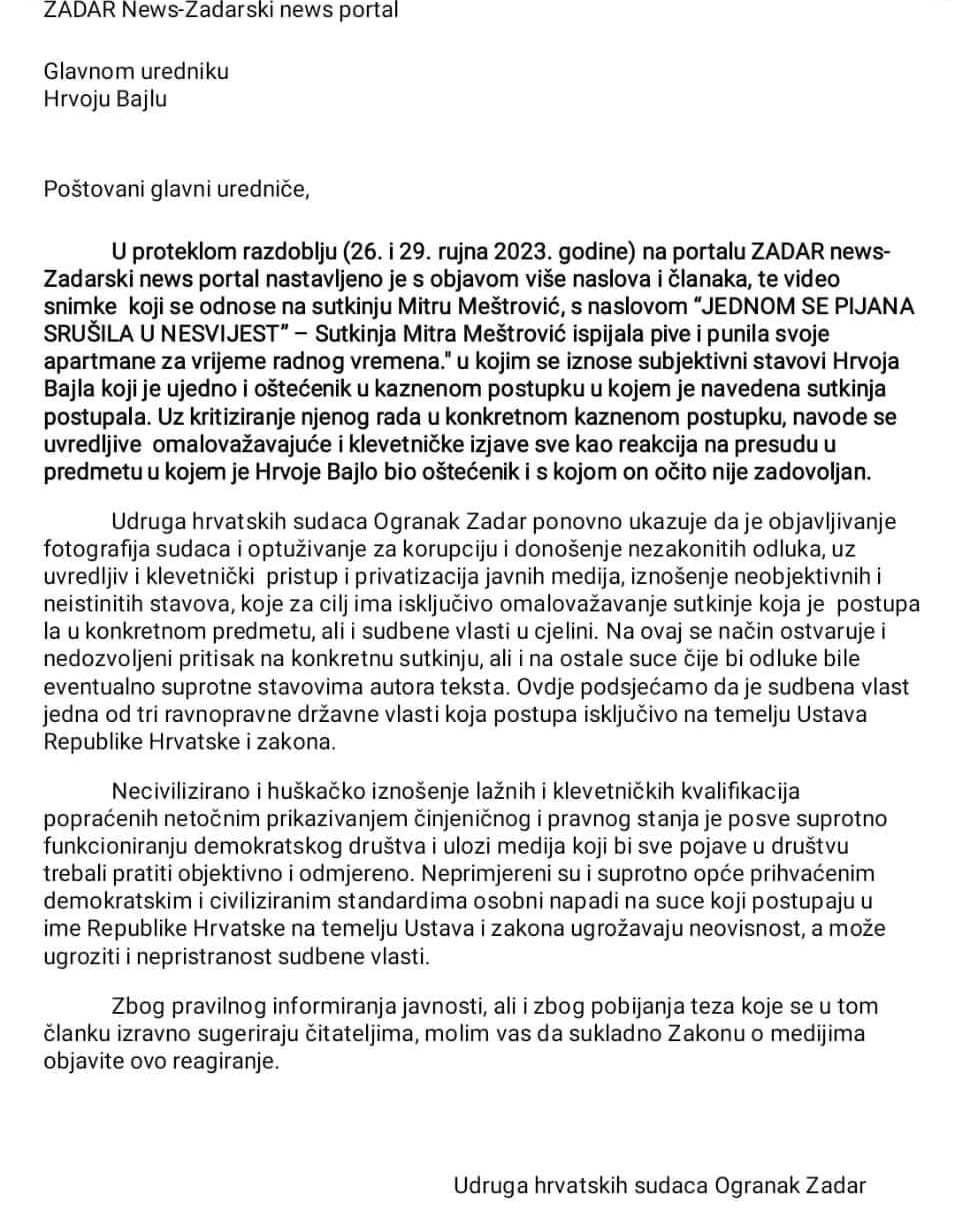 Suprotno Zakonu o medijima u skandaloznom i nepotpisanom pisamcu naslovljenom na glavnog urednika portala ZADAR News, Hrvoja Bajla, Udruga sudaca – ogranak Zadar, čiji nam je pamflet e-mailom poslao sudac Hrvoje Visković, pogazili su sve ono što čini vjerodostojnog, neovisnog, stručnog suca odnosno sutkinju.