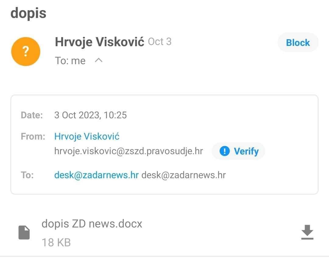 Nepotpisano pisamce poslao nam je sudac Hrvoje Visković sa službenog e-maila Županijskog suda u Zadru u ime “Udruge sudaca” za vrijeme radnog vremena