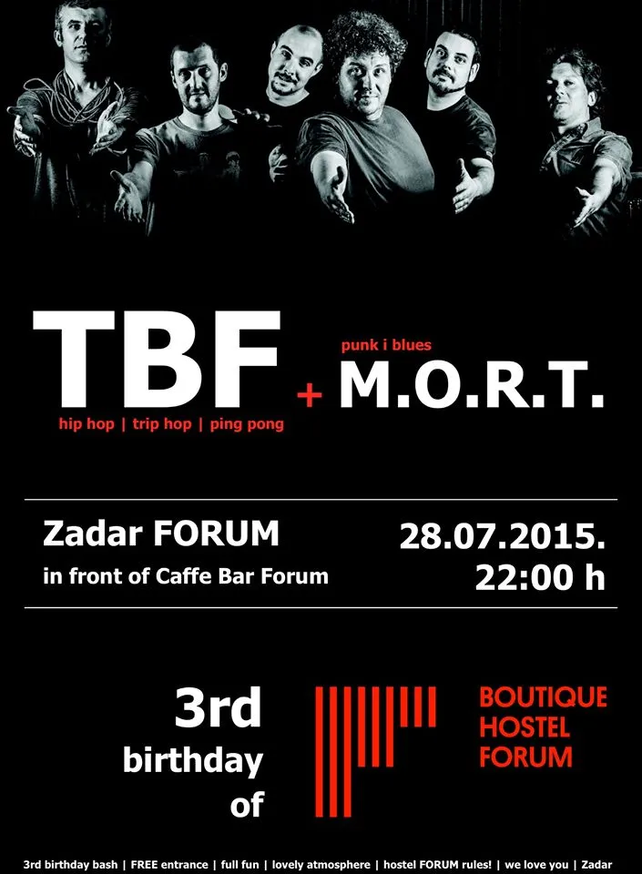 Zadarski Boutique Hostel Forum slavi treći rođendan. Tim povodom, sada već tradicionalno, za Zadrane i goste spremaju dobru svirku! 28. srpnja s početkom u 22 sata na binu ispred hostela, točnije na Forumu, kod terase kafića Forum, popet će se već poznati, Porinom skoro nagrađeni, bend M.O.R.T. Nakon njih, dolazi nam TBF koji će pokazati zašto već godinama slove kao jedan od najjačih hrvatskih bendova. Uz sve to, igrati ćemo se reflektorima i bojati zgradu hostela.