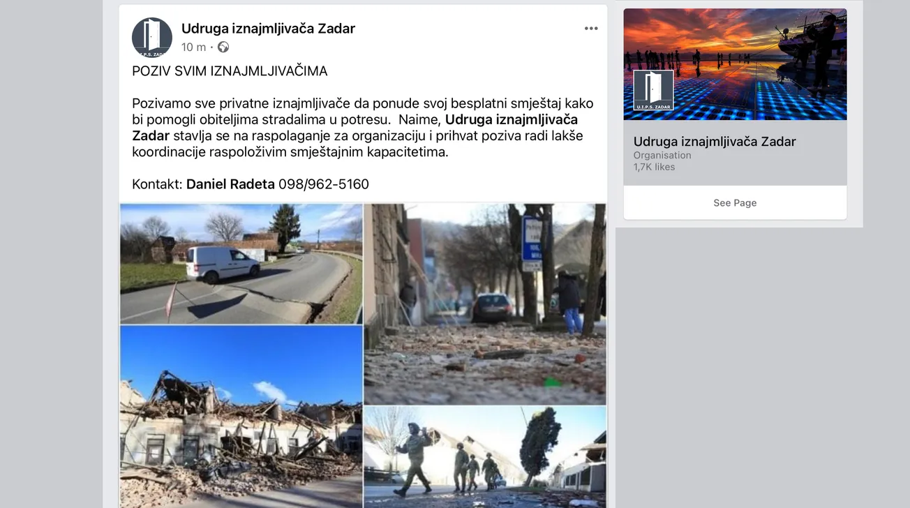 Pozivamo sve privatne iznajmljivače da ponude svoj besplatni smještaj kako bi pomogli obiteljima stradalima u potresu. Naime, Udruga iznajmljivača Zadar stavlja se na raspolaganje za organizaciju i prihvat poziva radi lakše koordinacije raspoloživim smještajnim kapacitetima.