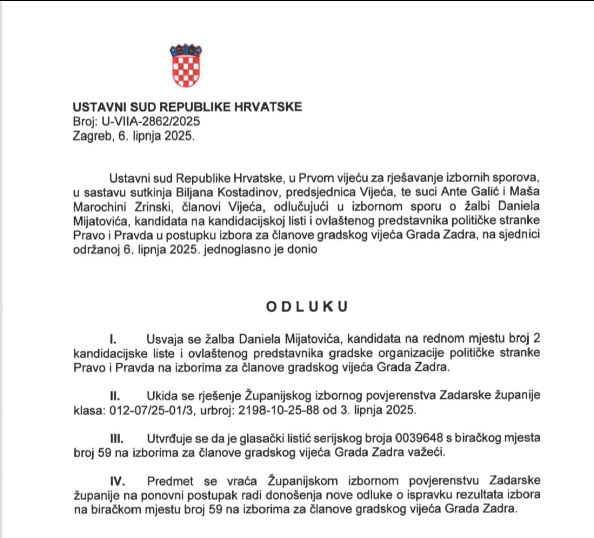 Nakon poraza ŽIP-a nije tročlano vijeće Ustavnog suda, u sastavu Biljana Kostadinov, Ante Galić i Maša Marochini Zrinski uvažena je žalba Daniela Mijatovića iz stranke Pravo i pravda, te je poništena odluka Županijskog izbornog povjerenstva.
