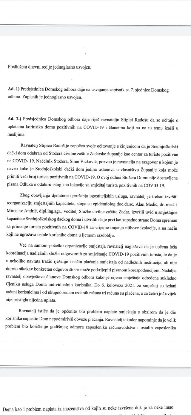 Krenimo:1. Ravnatelj tvrdi da mu nikad nije dostavljena odluka prema kojoj se određuje Srednjoškolski đački dom kao lokacija na kojoj će se izvršavati mjera izolacije za turiste pozitivne na Covid-19, a koji nemaju gdje izvršiti mjeru izolacije. Time direktno proziva načelnika Stožera dožupana Vickovića. Očekujemo očitovanje dožupana o tome kad i kako je Stožer odlučio da đački dom bude “karantenski” smještaj? Gdje je ta odluka? 2. Ravnatelj također tvrdi da je bila loša koordinacija nadležnih službi za smještanje Covid-19 pozitivnih turista? Kojih službi? Stožera? Zavoda za javno zdravstvo Zadarske županije? Ako te službe ne rade kvalitetno potencijalno mogu ugroziti zdravlje građana te je ravnatelj to dužan objasniti? 3. E sad idemo na zanimljive detalje. U očitovanju ravnatelj Radoš tvrdi da je izdano 7 računa. Znači li to da je mjera izolacije na adresi đačkog doma određena za 7 stranih turista? To je dosta zanimljivo jer ravnatelj Zavoda za javno zdravstvo Škrgatić već dva dana ne odgovara na upit o izrečenim mjerama izolacije na adresi đačkog doma. Taj podatak mora imati jer su o tome dužni obavijestiti i nadležnu policijsku postaju. Štite li se međusobno ravnatelji javnih ustanova?Zašto ravnatelj Škrgatić skriva taj podatak? 4. Ako je Stipica Radoš imao oko 1600 eura na svom računu od uplate za karantenski smještaj, a naplaćena su tri računa, nameću se nova pitanja. Iznos od 1600 eura iznosi oko 11.800 kuna. Ako taj iznos podijelimo s 245 koliko iznosi jedan dan dolazimo do iznosa od 48,16. To bi bio okvirno broj dana koji je naplaćen na njegov privatan račun. Ako pak taj iznos podijelimo s 3, jer je toliko računa naplaćeno dolazimo do broja 16. Dakle, prema njegovim tvrdnjama ta tri Covid pozitivna turista su svaki bili po 16 dana u izolaciji. Problem je samo što izolacija ne traje 16 dana. Dakle, netko opet laže. 5. Najvažnije na kraju. Imamo priznanje ravnatelja da je novac primio na svoj račun i on je i dalje ravnatelj? Gdje mi to živimo? Nevjerojatno je da netko javnu uslugu naplati na svoj račun i ne da ostavku na mjesto ravnatelja.Ostavka! Odmah! Odustati od razmontiravanja njegovih laži neću. I neću odustati dok ne bude smijenjen.Ostavka, jer sve drugo je gadljivo i mučno za gledati! #aferaIBAN19
