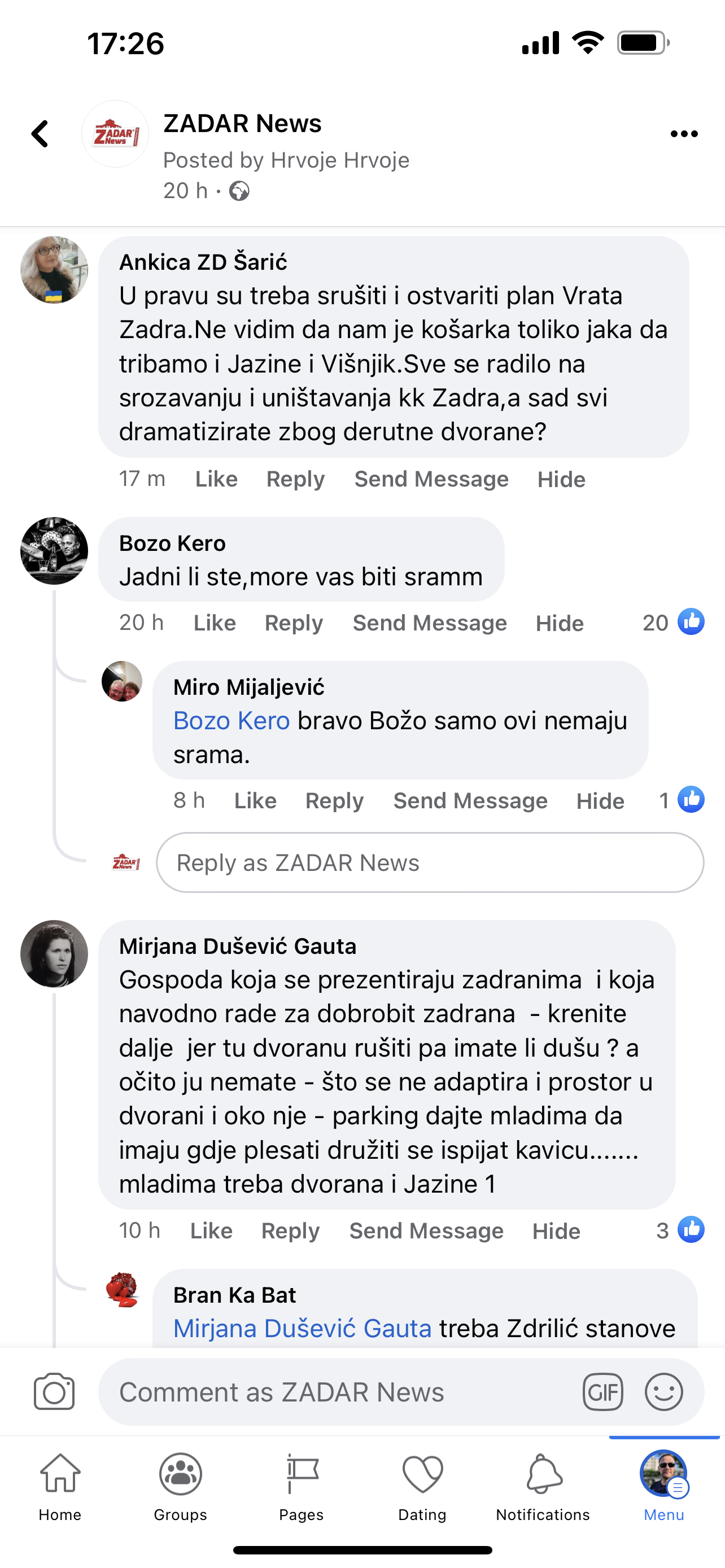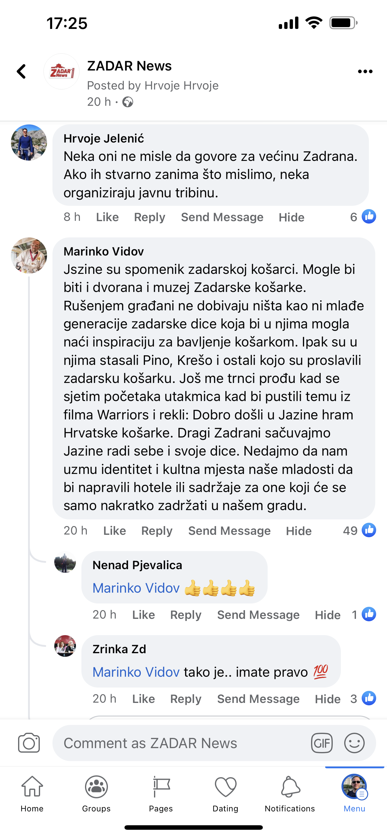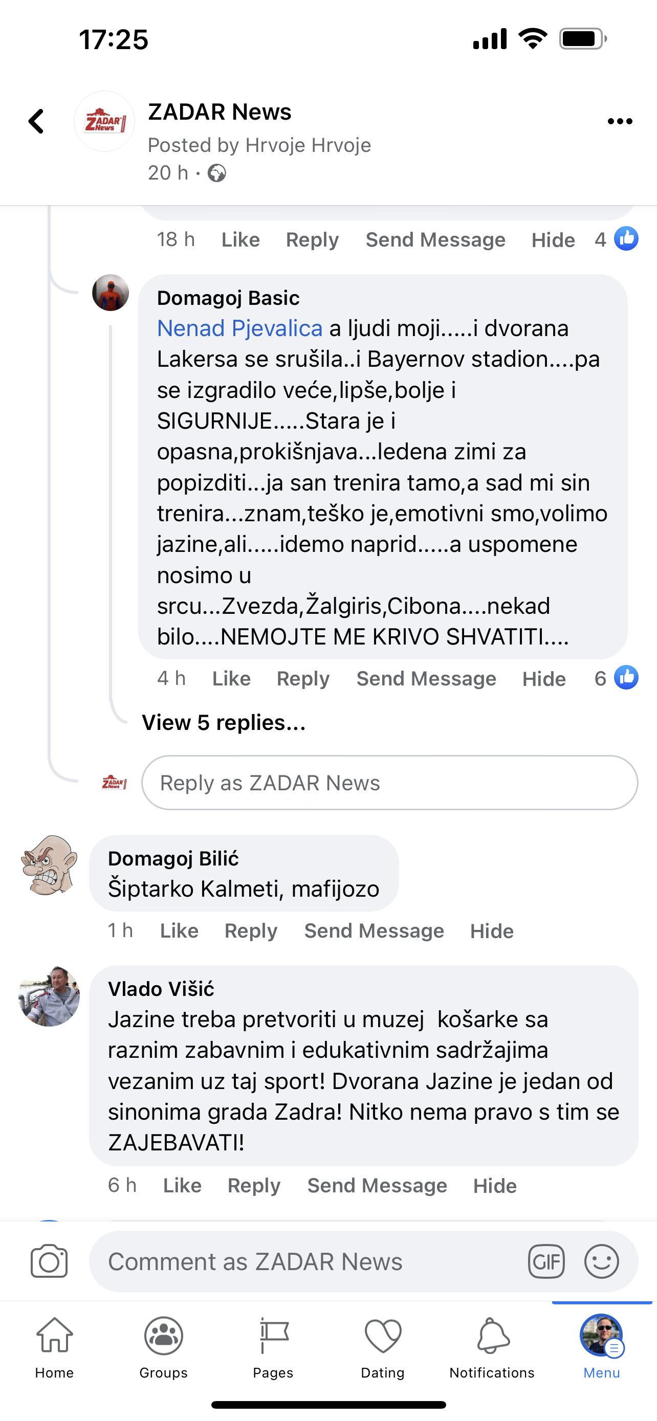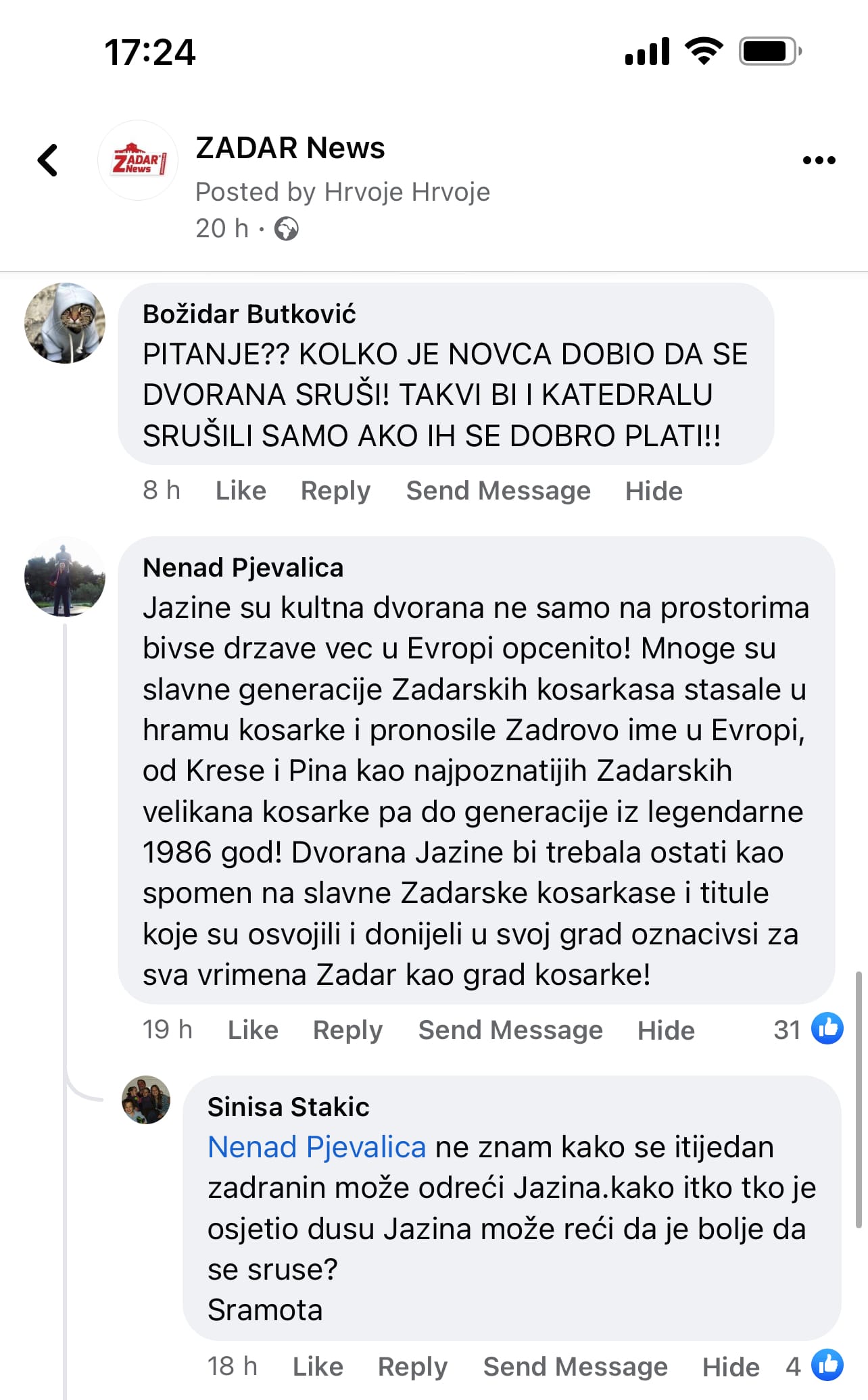 Nevjerojatno veliki broj Zadrana i onih kojima je Zadar u srcu od sinoć na Facebook stranici ZADAR Newsa iskazuju svoj gnjev i bijes odlukom Božidara Kalmete da se sruši kultna košarkaška dvorana Jazine.