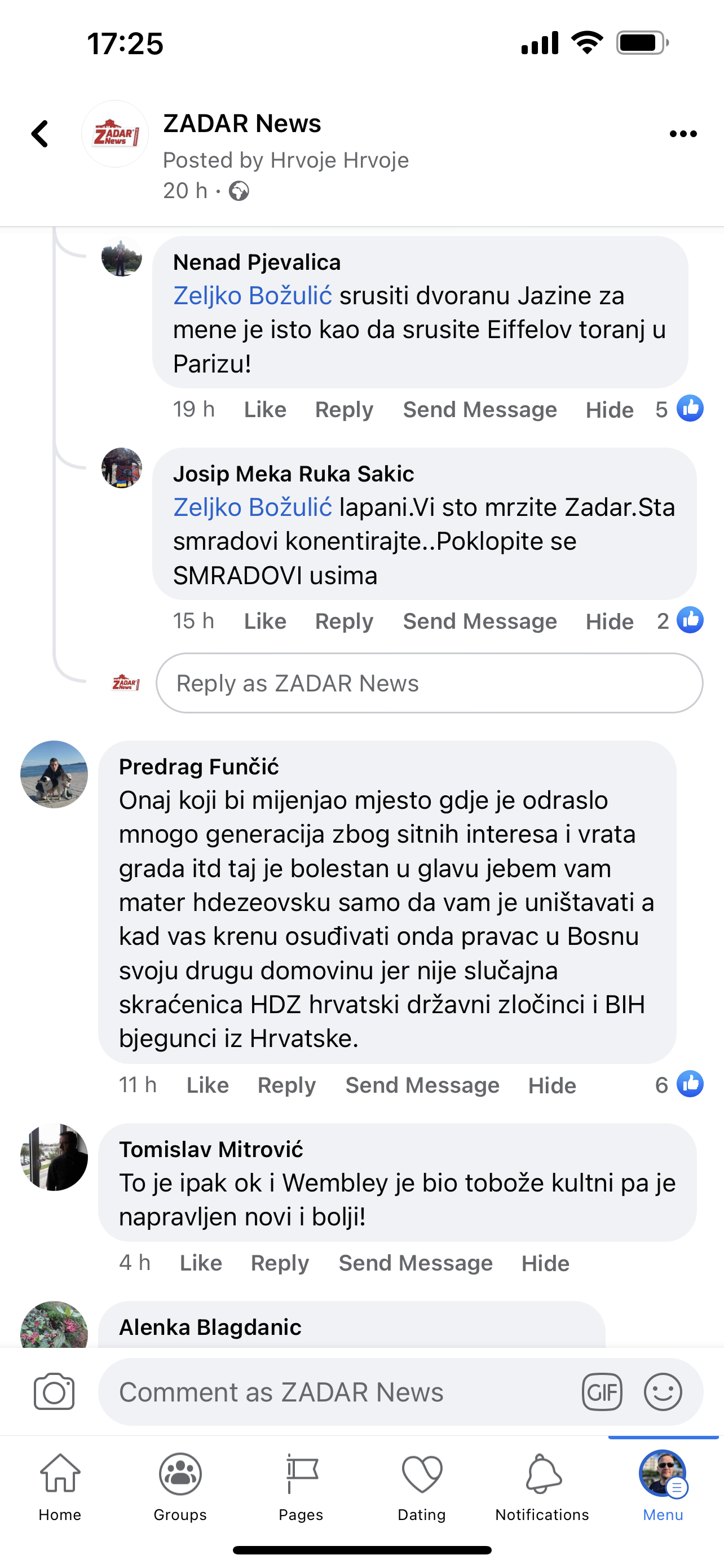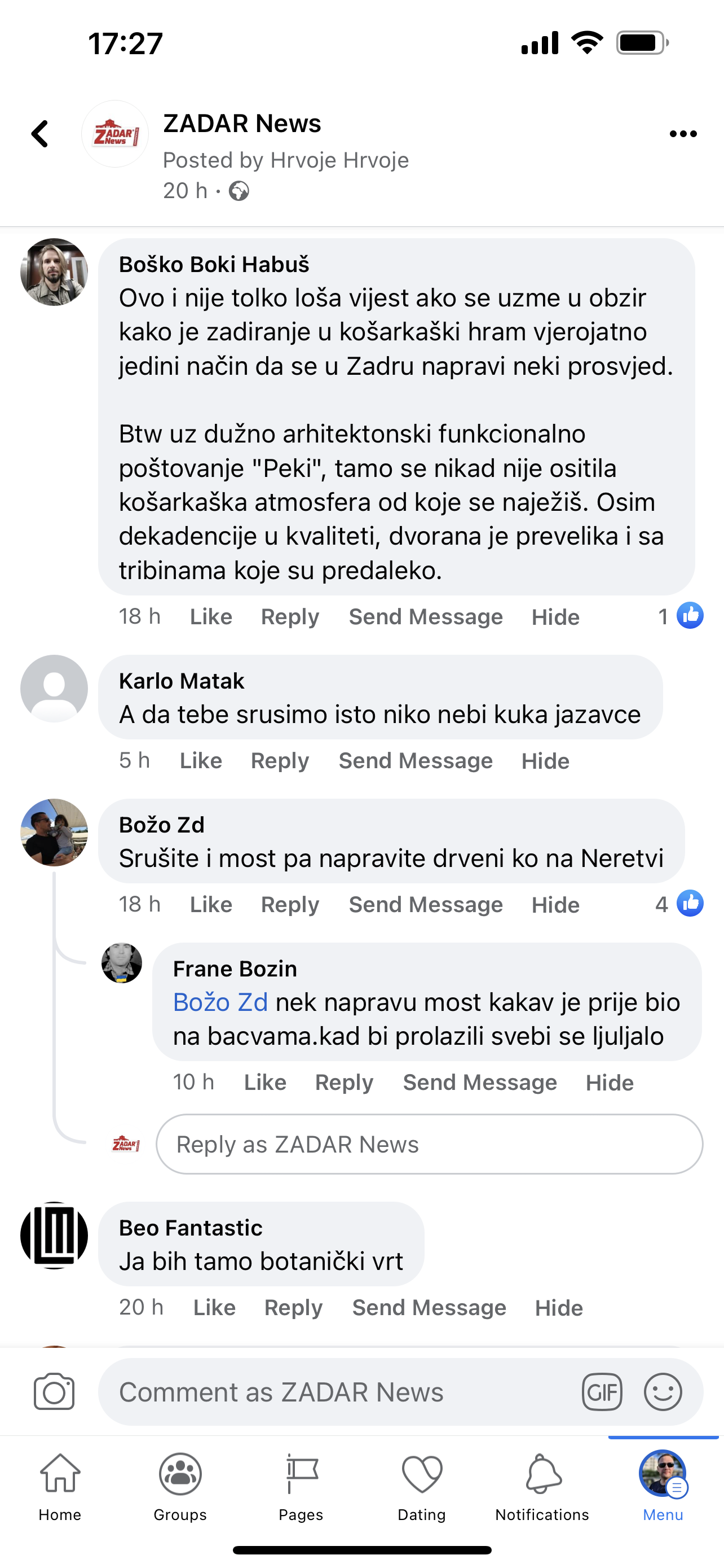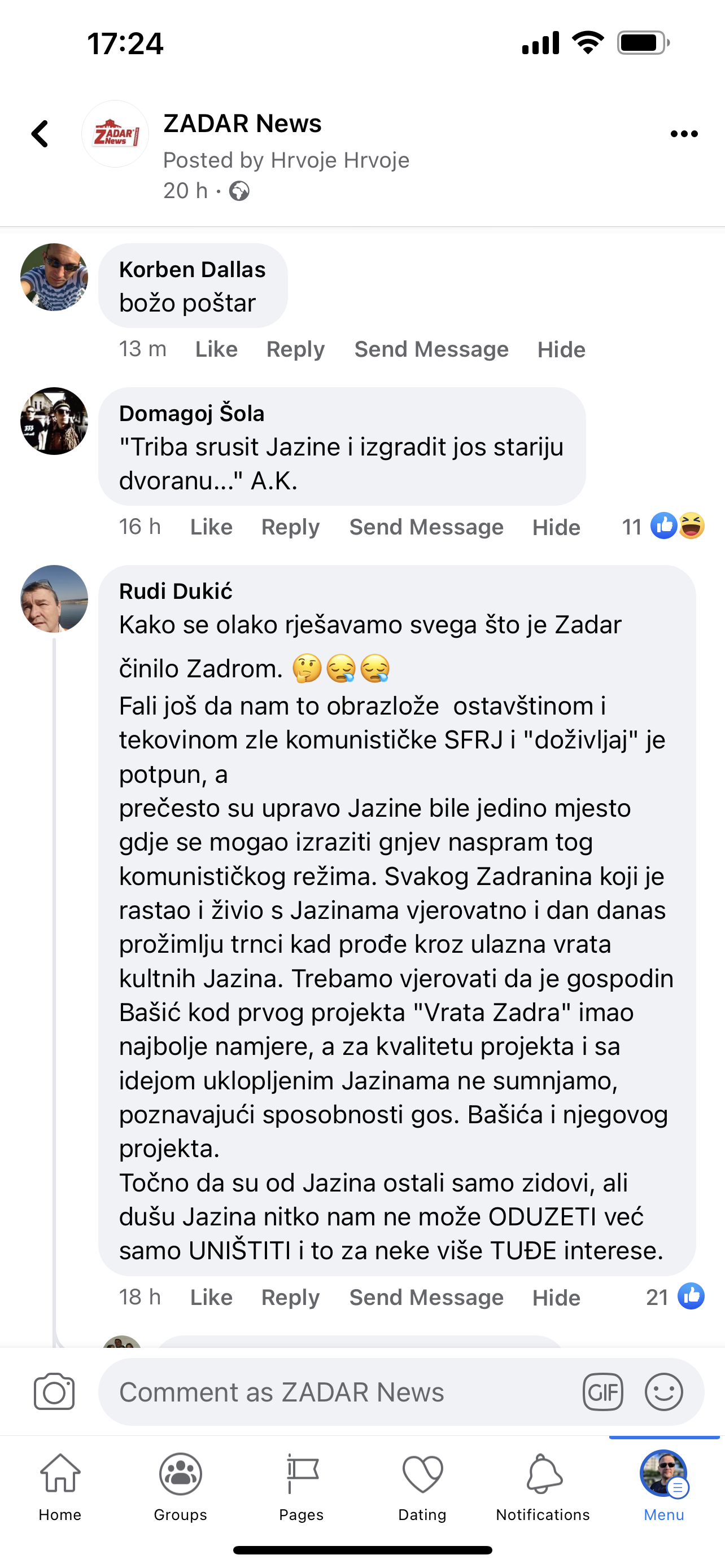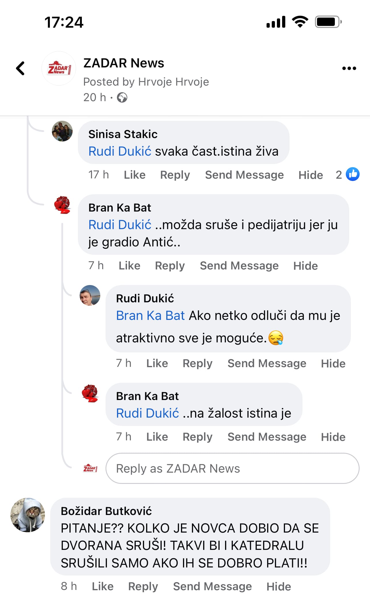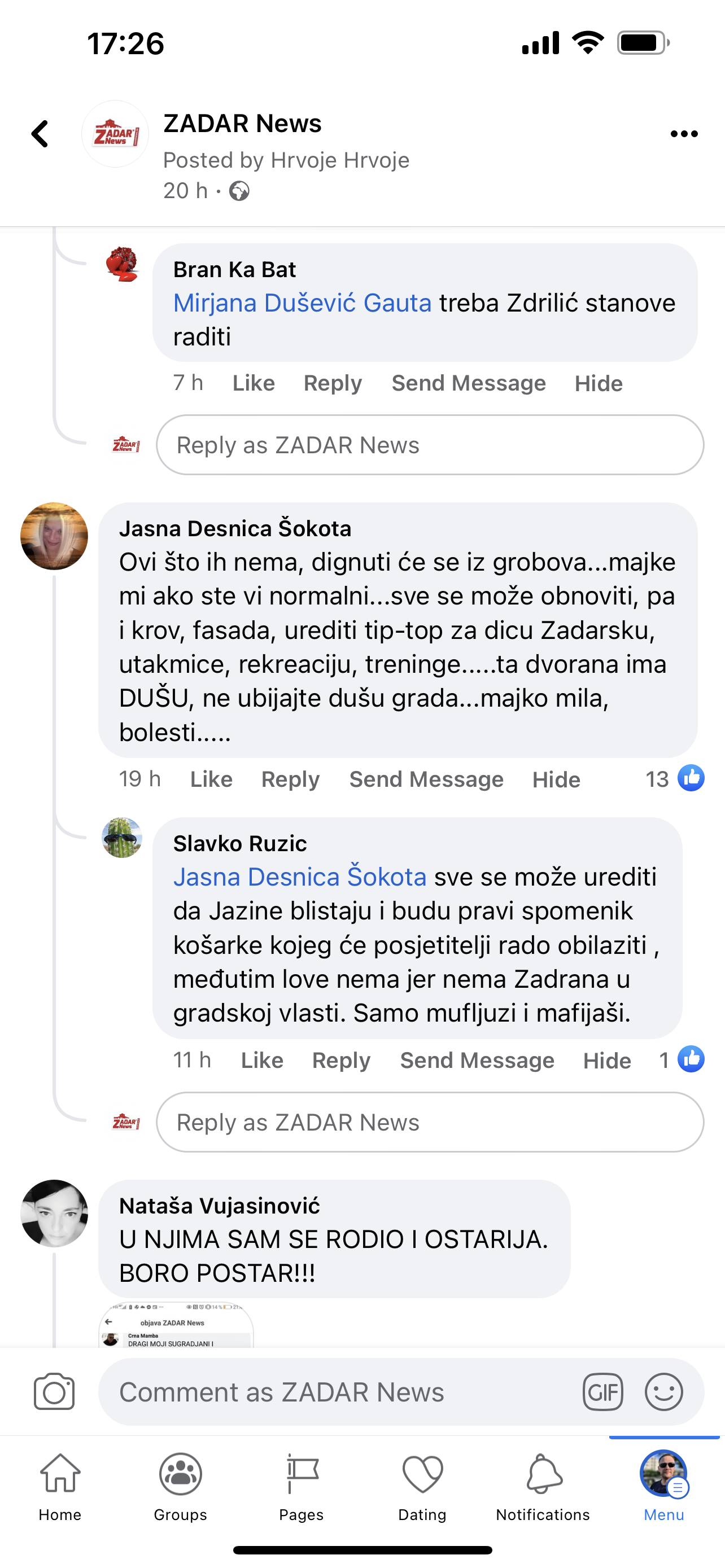 Nevjerojatno veliki broj Zadrana i onih kojima je Zadar u srcu od sinoć na Facebook stranici ZADAR Newsa iskazuju svoj gnjev i bijes odlukom Božidara Kalmete da se sruši kultna košarkaška dvorana Jazine.