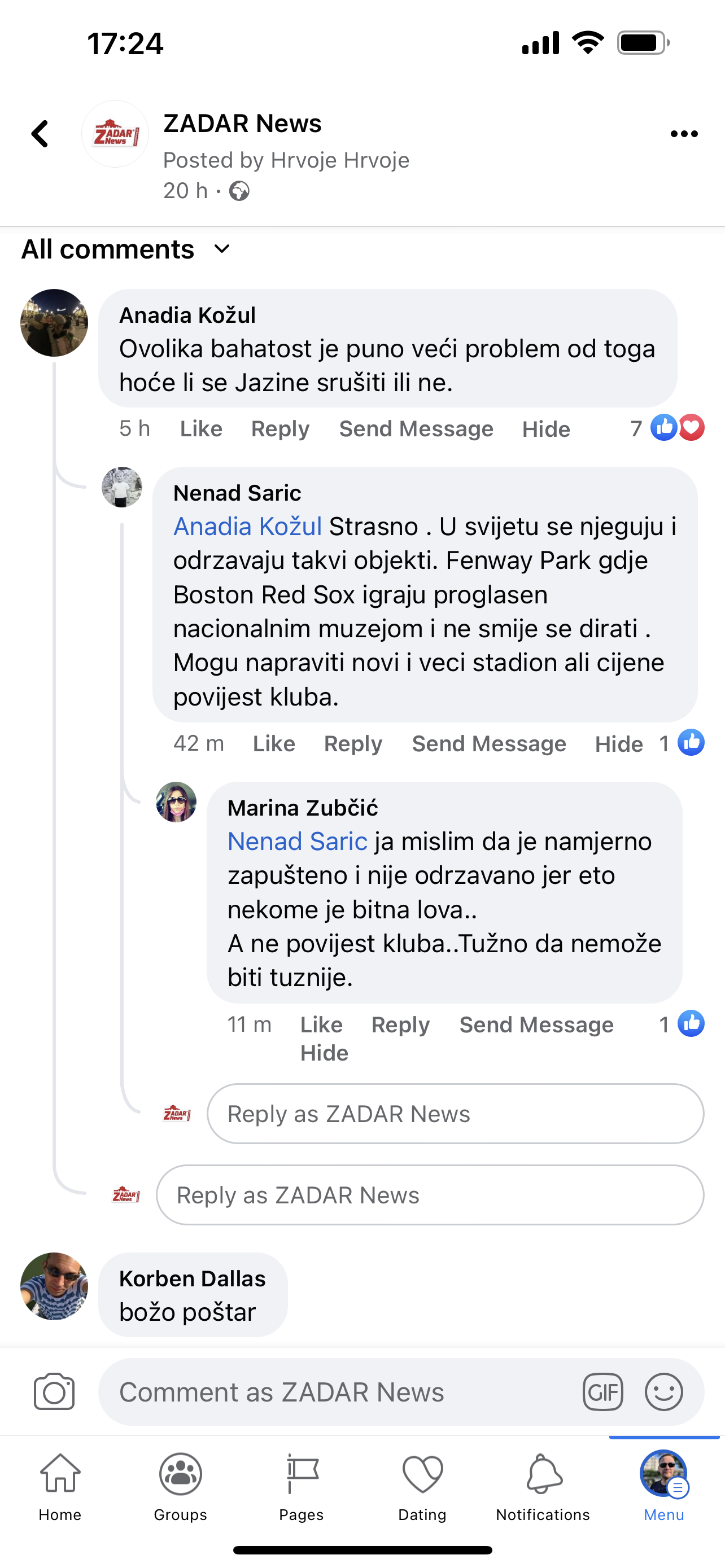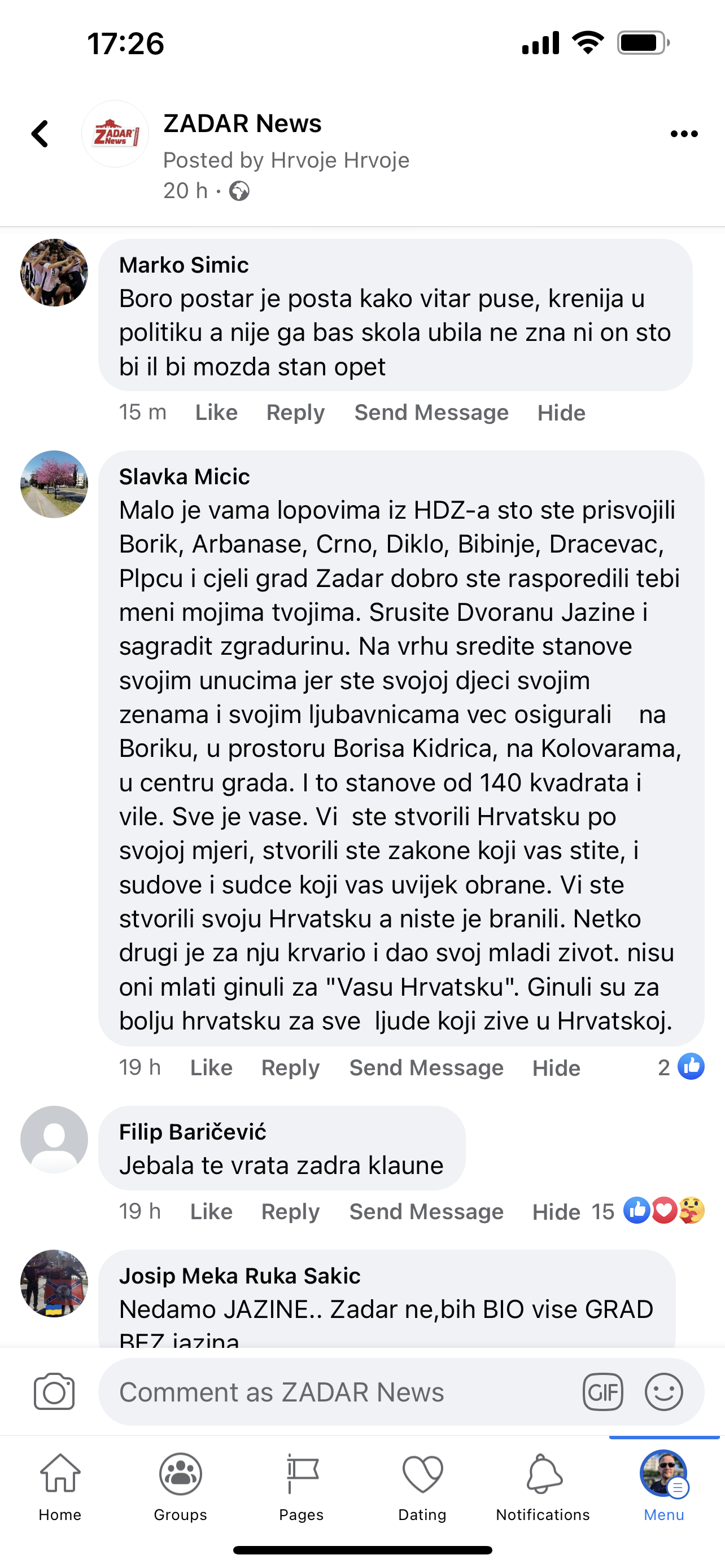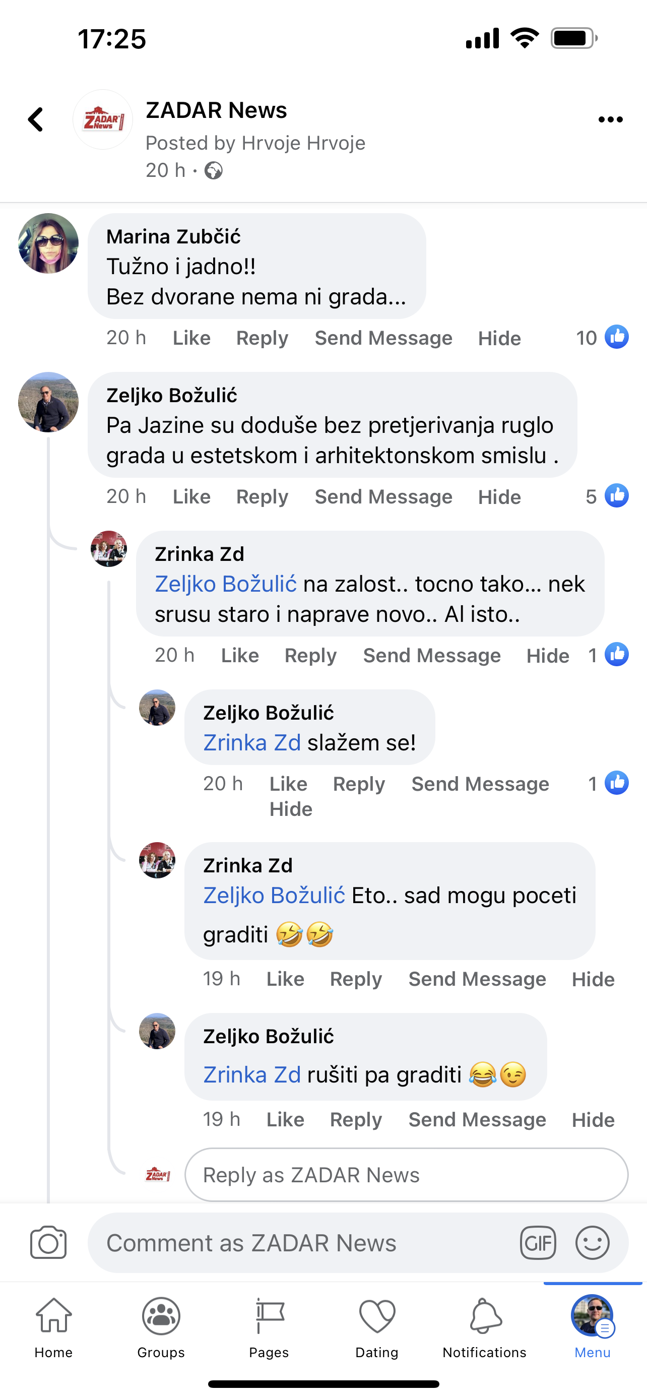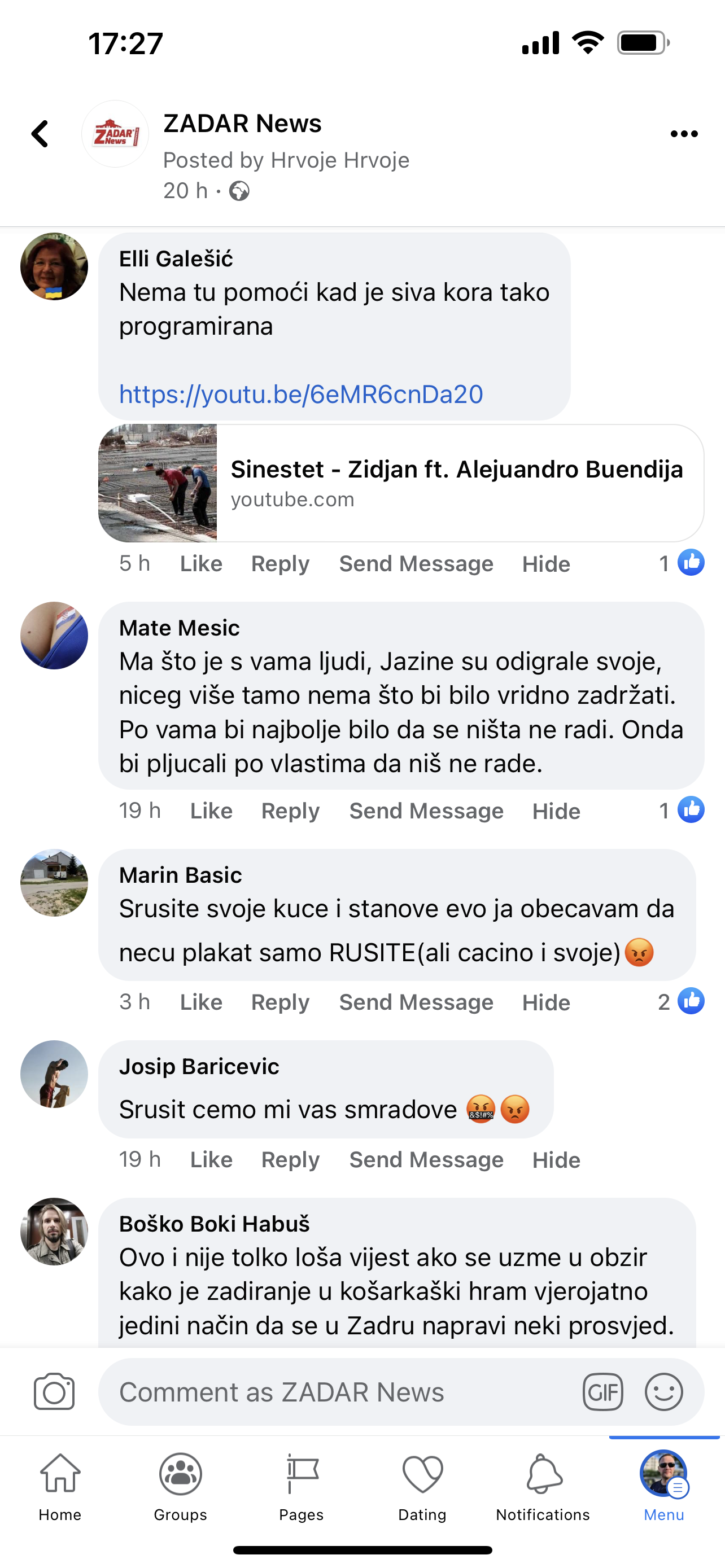 Nevjerojatno veliki broj Zadrana i onih kojima je Zadar u srcu od sinoć na Facebook stranici ZADAR Newsa iskazuju svoj gnjev i bijes odlukom Božidara Kalmete da se sruši kultna košarkaška dvorana Jazine.