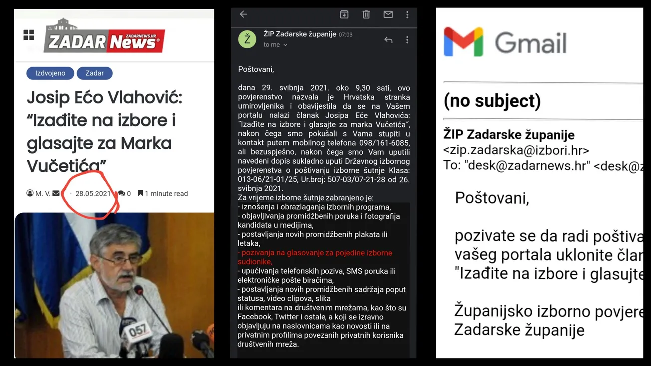 Županijsko izborno povjerenstvo jučer je poslalo ZADAR Newsu dopis u kojemu inzistiraju da uklonimo članak u kojemu je Josip “Ećo” Vlahović u intervjuu za naš portal od 28. svibnja pozvao Zadrane da na izborima u drugom krugu podrže Marka Vučetića.