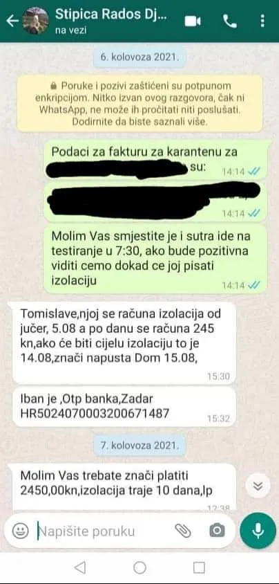 Iznos spomenuti u poruci je na kraju manji i iznosio je 1.715,00 kuna jer je izolacija bila kraća.
