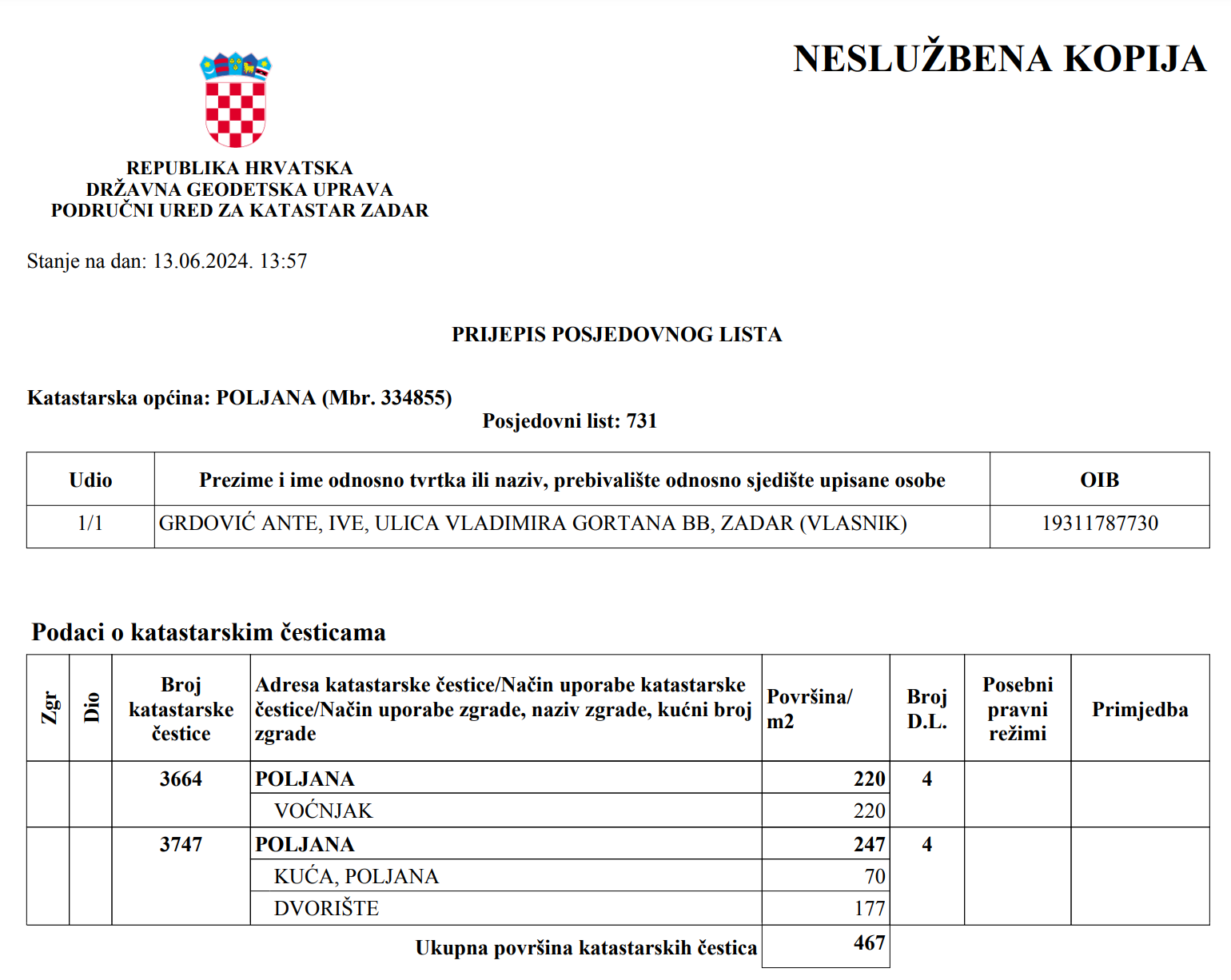 Višemilijunski turistički kompleks u Poljani na otoku Ugljanu bio je sinoćnja tema ZADAR Newsovog podcasta uživo. U emisiji su objavljeni skandalozni dokumenti koji upućuju na to da je cijeli objekt zapravo milijunski biznis za obitelj Božidara Kalmete, dok u stvarnosti, ako je vjerovati dokumentima iz katastra, pričamo o malenom kućerku od 70 m2.
